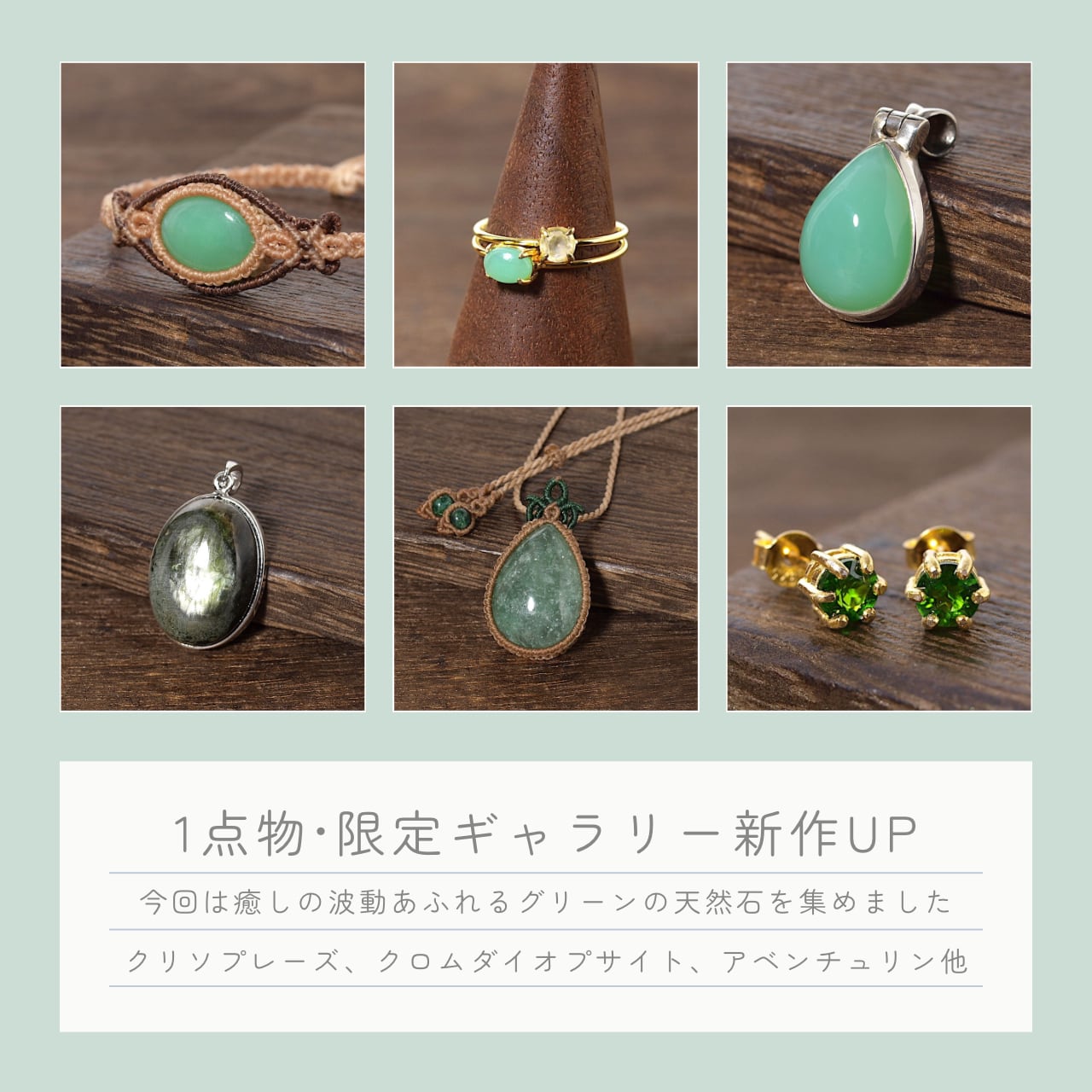 初登場のグリーンサファイアをはじめ、日高産翡翠など希少な石を15点UP