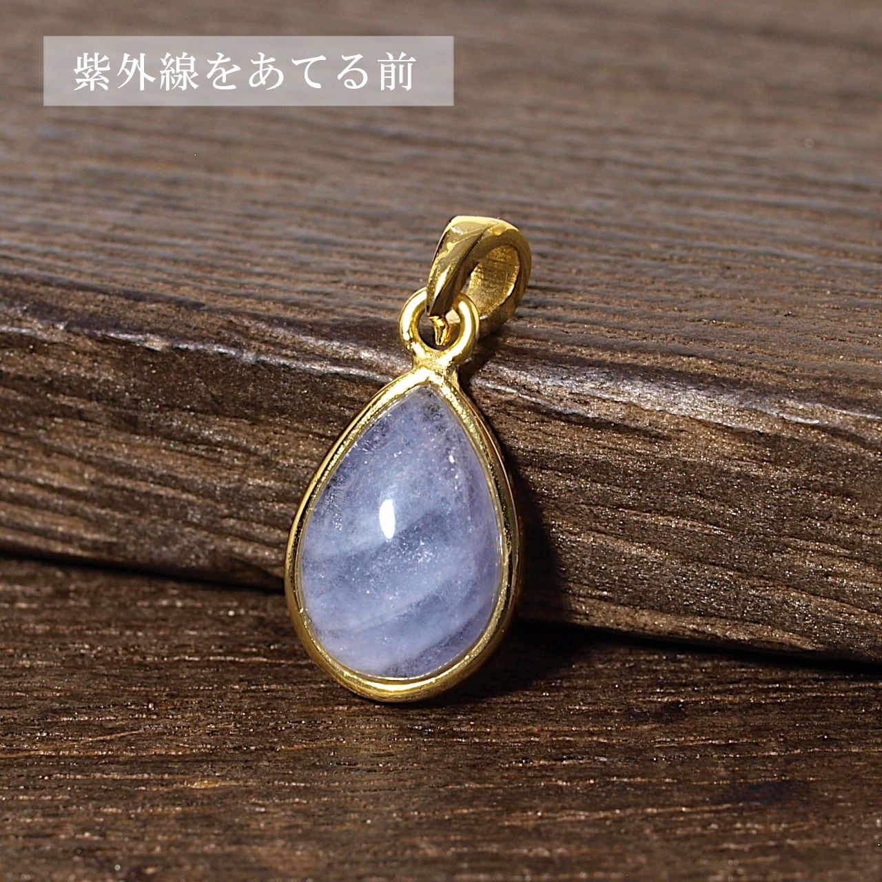 ハックマナイトは色の変化を楽しめるように、表面積を大きく取った形に加工されることが多いので、今回のペンダントトップのような小ぶりタイプはあまり手に入りません。ハックマナイト特有の落ち着いた色あいもあって、さりげないサイズ感はとても使いやすいと思います。