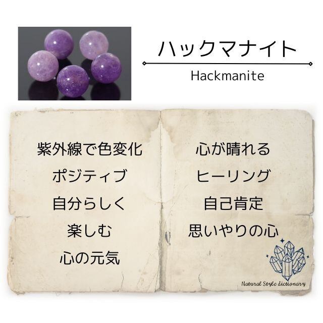 ハックマナイトはここ数年で人気が高まった、いわば新顔のパワーストーンです。それだけに、言い伝えや石言葉など、この石のパワーや意味については、あまり情報がありません。私の個人的な感想としては、自分らしさをさりげなく表現できるような、とても広がりのある波動を感じます。