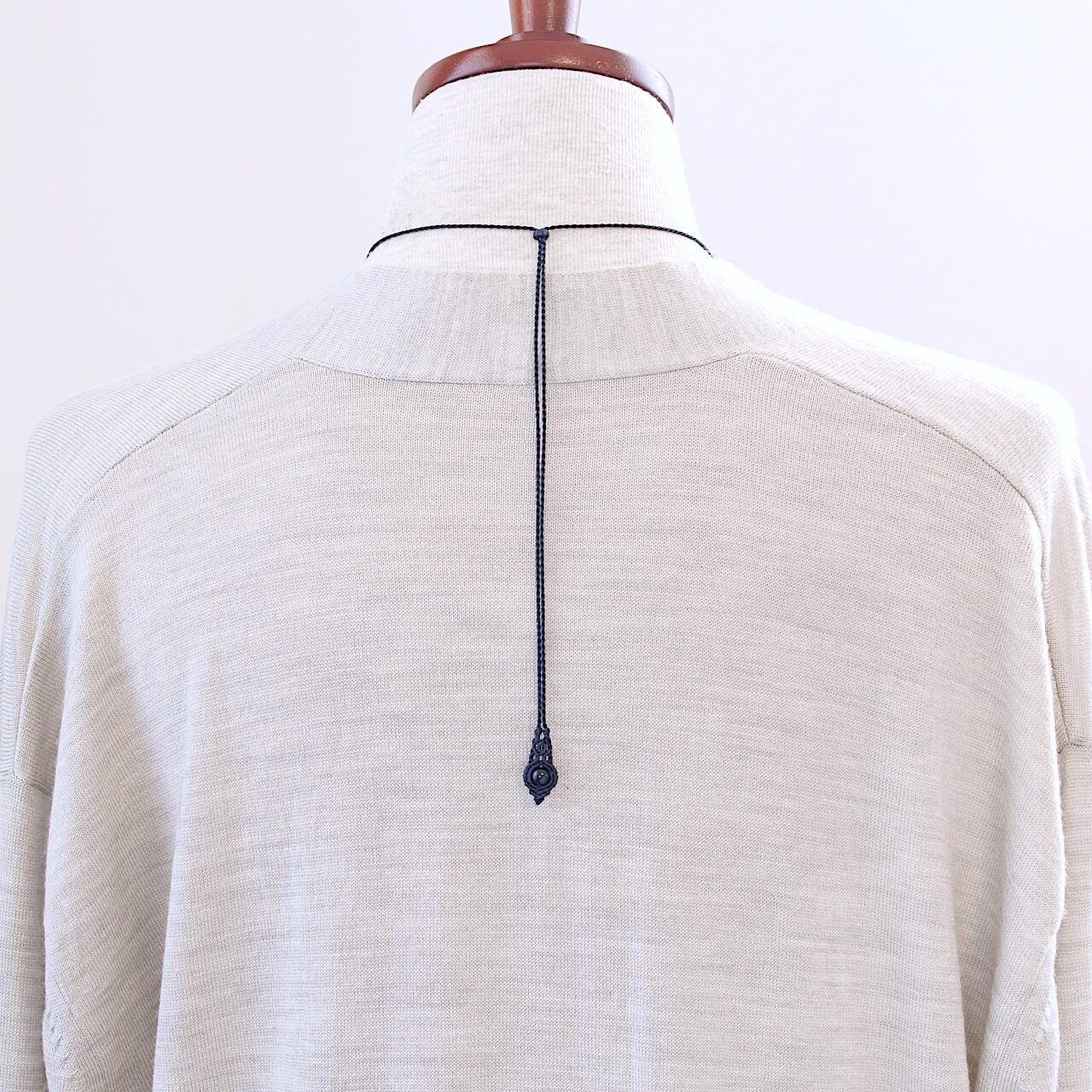 ネックレス紐の端の飾り編みのところには、メインと同じ種類の天然石を編み込むことが多いのですが、あいにく希少な黒翡翠が他に手元にはありませんでした。そこで黒翡翠に波長が合う石をと考えてブラックトルマリン入り水晶を選びました。黒い天然石の中でも特に大人な雰囲気を持ち、負のエネルギーを寄せつけもしないような組み合わせです。