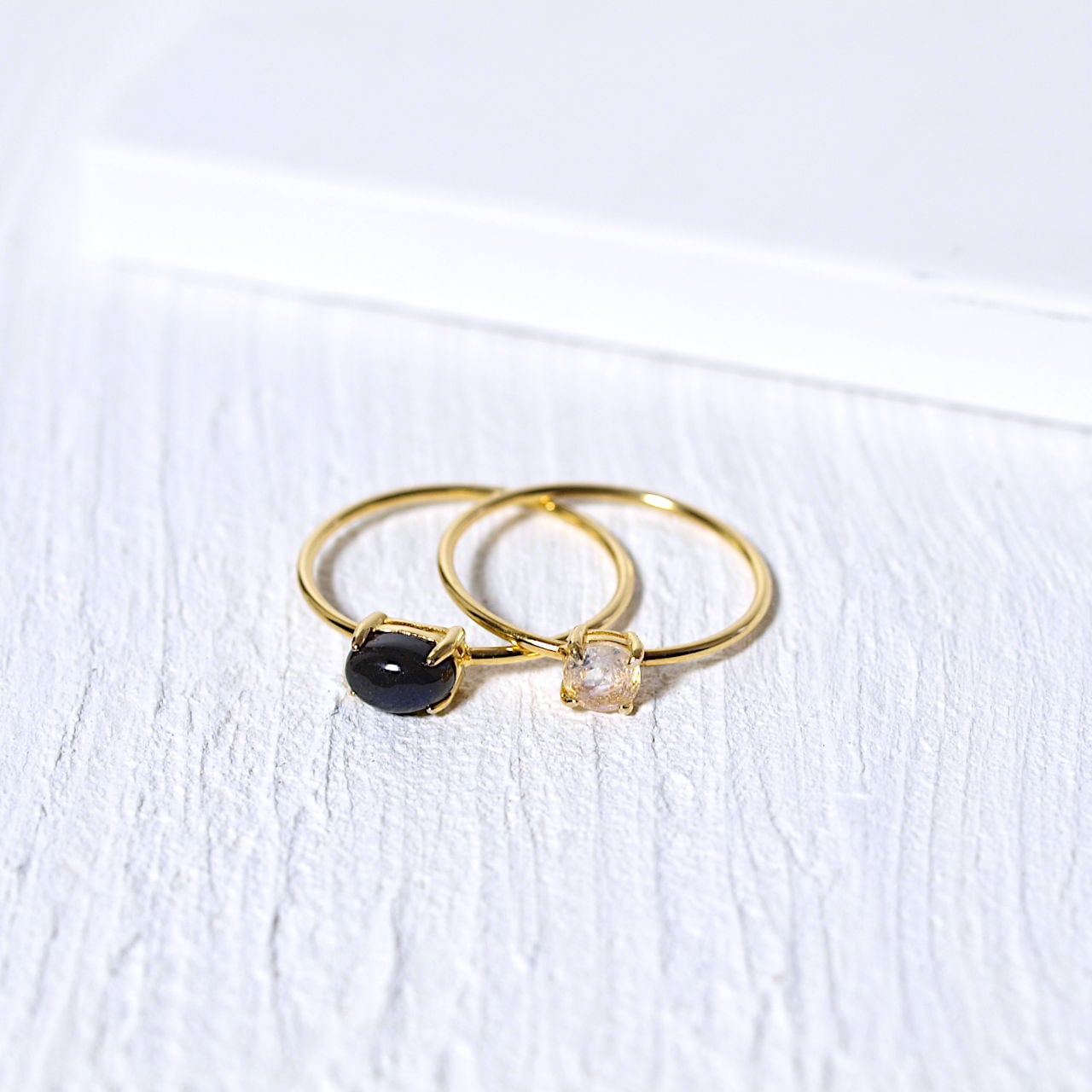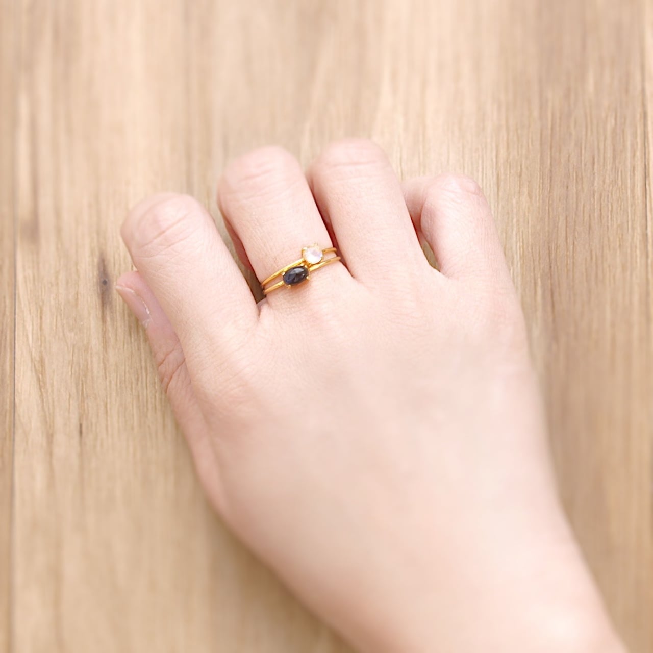 1本だけ着ければ洗練された雰囲気に、重ねる時は石の位置を少しずらすと2連のような華やかな雰囲気に。その日の気分やスタイルに合わせてアレンジが楽しめるセットリングは、毎日に寄り添う小さなお守りです。今回はブラックラブラドライトとレインボームーンストーンを組み合わせて作りました。