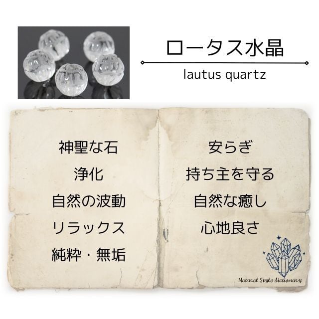 パワーストーンにおいて、水晶は最も有名にして神聖な石として、世界中で愛されています。純粋で、清らかなパワーを持つこの石を蓮の形に象ることで、神聖な守護の力が高まり、強い浄化力を発揮すると考えられています。