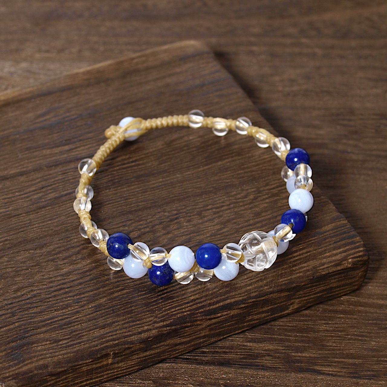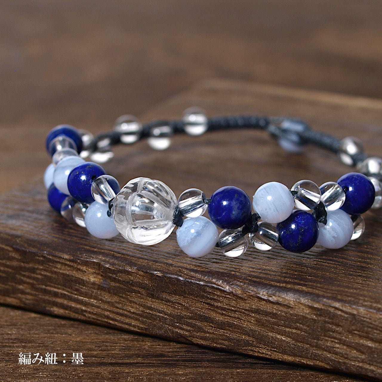 また、水晶、ラピスラズリ、ブルーレースは、持ち主を危険から守り、心に安らぎをもたらしてくれるパワーストーンとして知られています。誰にでも馴染みやすい波動で、幅広い層から人気の高い組み合わせです。合わせる編み紐の色によって自分らしくカスタマイズできますので、ぜひお好きな紐色でオーダーしてください。