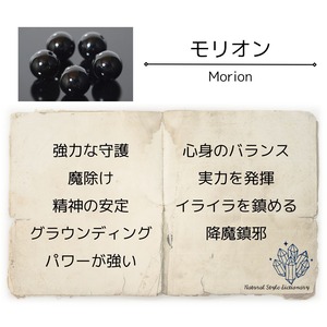 この石の真っ黒な外見から「近寄りがたい」「馴染みにくい」といった印象を持たれる方もいらっしゃるようですが、実際に手にとってみると、心がとても安らかで、落ち着いた状態へ導かれるのを感じられるでしょう。モリオンは、持ち主の精神や魂を安定させて、イライラを鎮め、グラウンディングを助けると伝えられています。