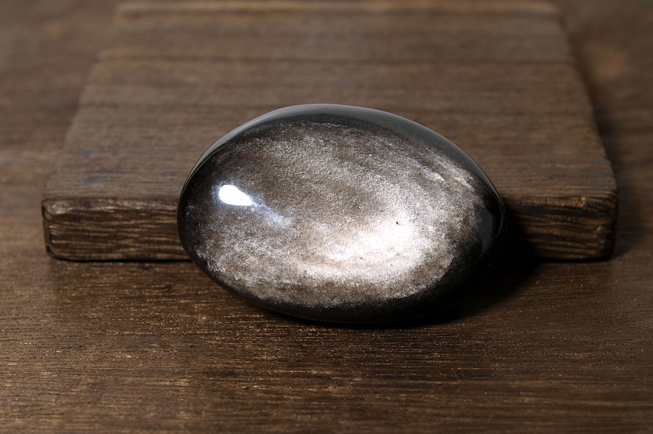 オブシディアンといえば「黒い石」ですが、なかには、角度によって様々な色の輝き(シラー)を見ることができる物もあります。特に、黒地に銀の砂をまぶしたような輝きが浮かぶ石をシルバーオブシディアンと呼びます。レインボーオブシディアンの光がピンクやグリーン、イエローなど様々なのに対して、シルバーオブシディアンの輝きは、上品な白銀色のみ。シックで神秘的な雰囲気があり、女性はもちろん男性からも人気の高いパワーストーンです。