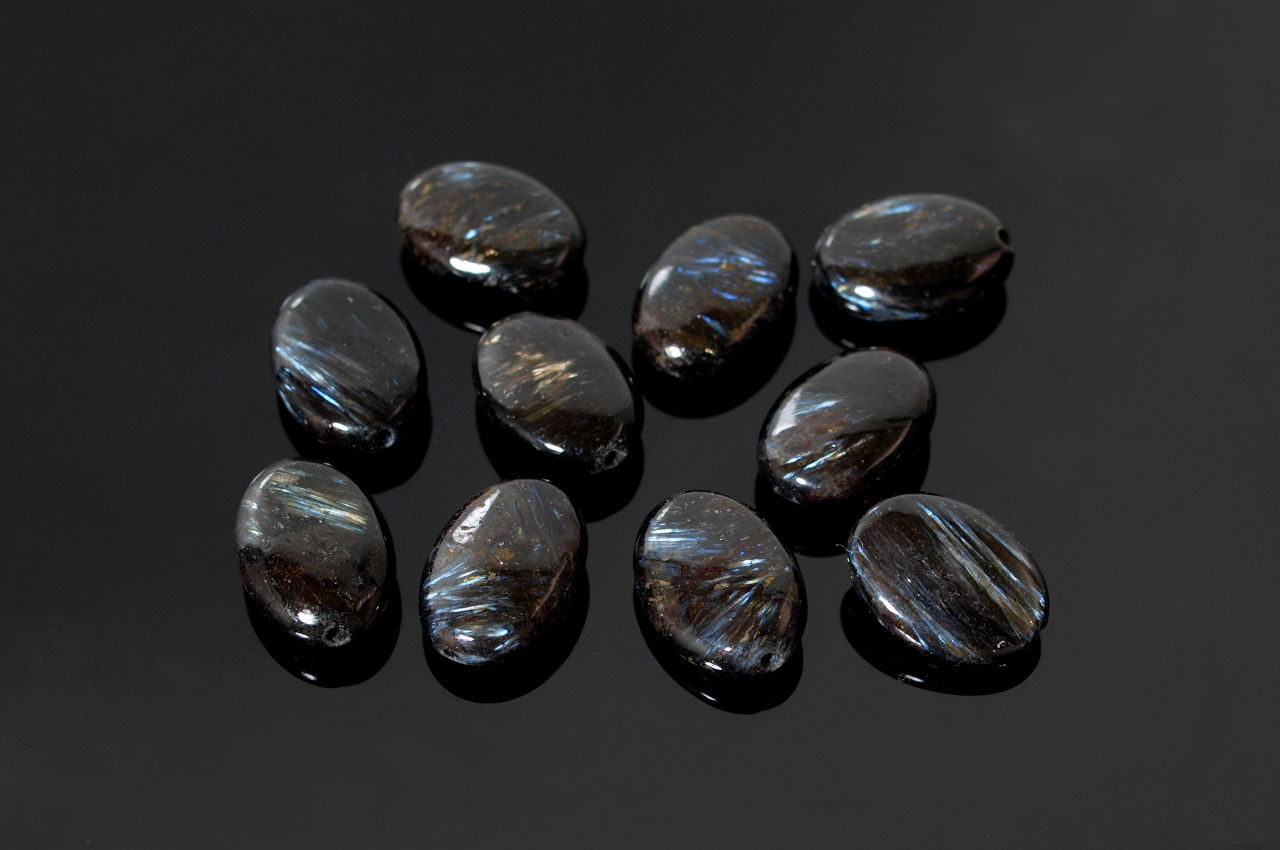 この石は「アンソフィライト」「ゲードライト」「パイライト」「クォーツ」「スタロウライト」など、複数の鉱物が混合して成り立っています。透明感のない漆黒の石ですが、角度によっては、ブルー・グリーン・ゴールド・イエロー・レッドなど、光のような色の輝きを見ることができます。これは、複数の鉱物が層状に構成されているため、ラブラドライトのようなイリデッセンスが見られるのです。