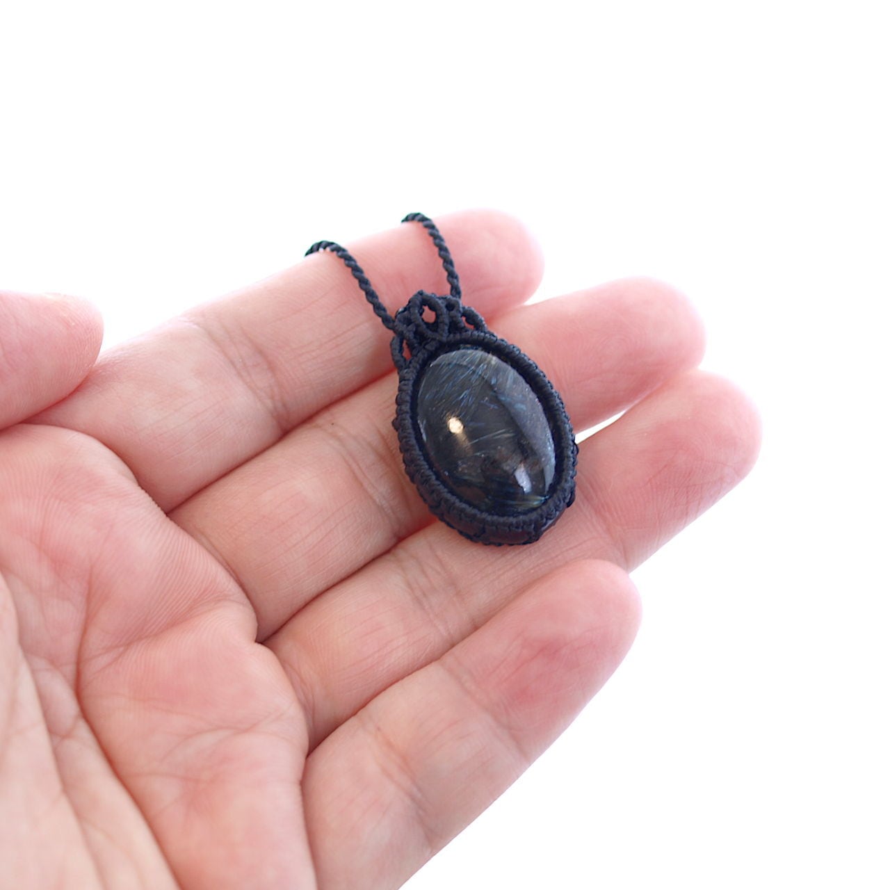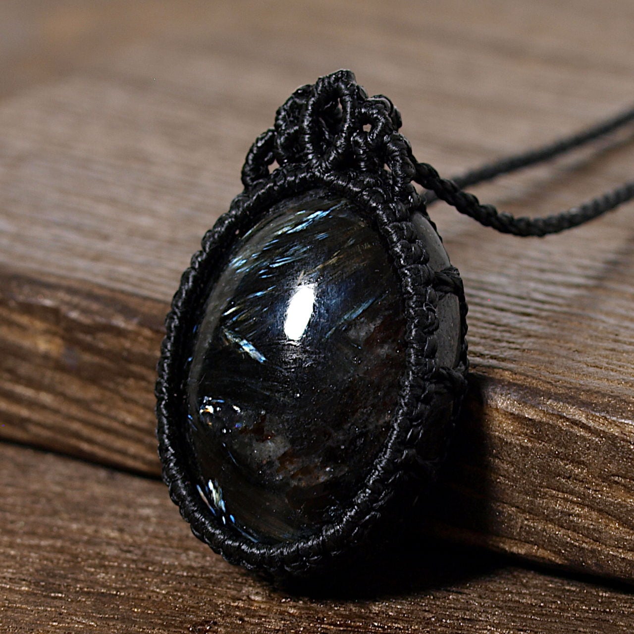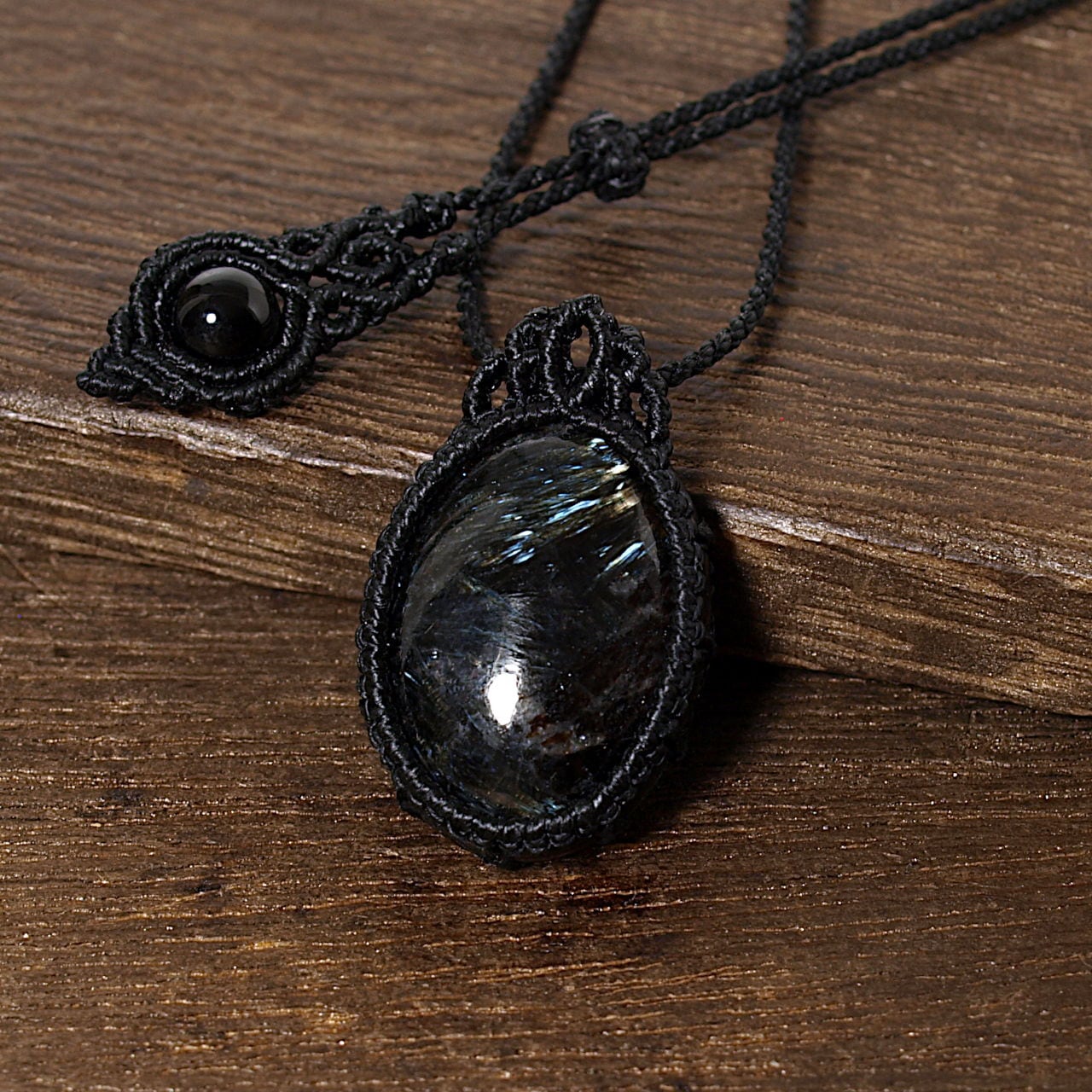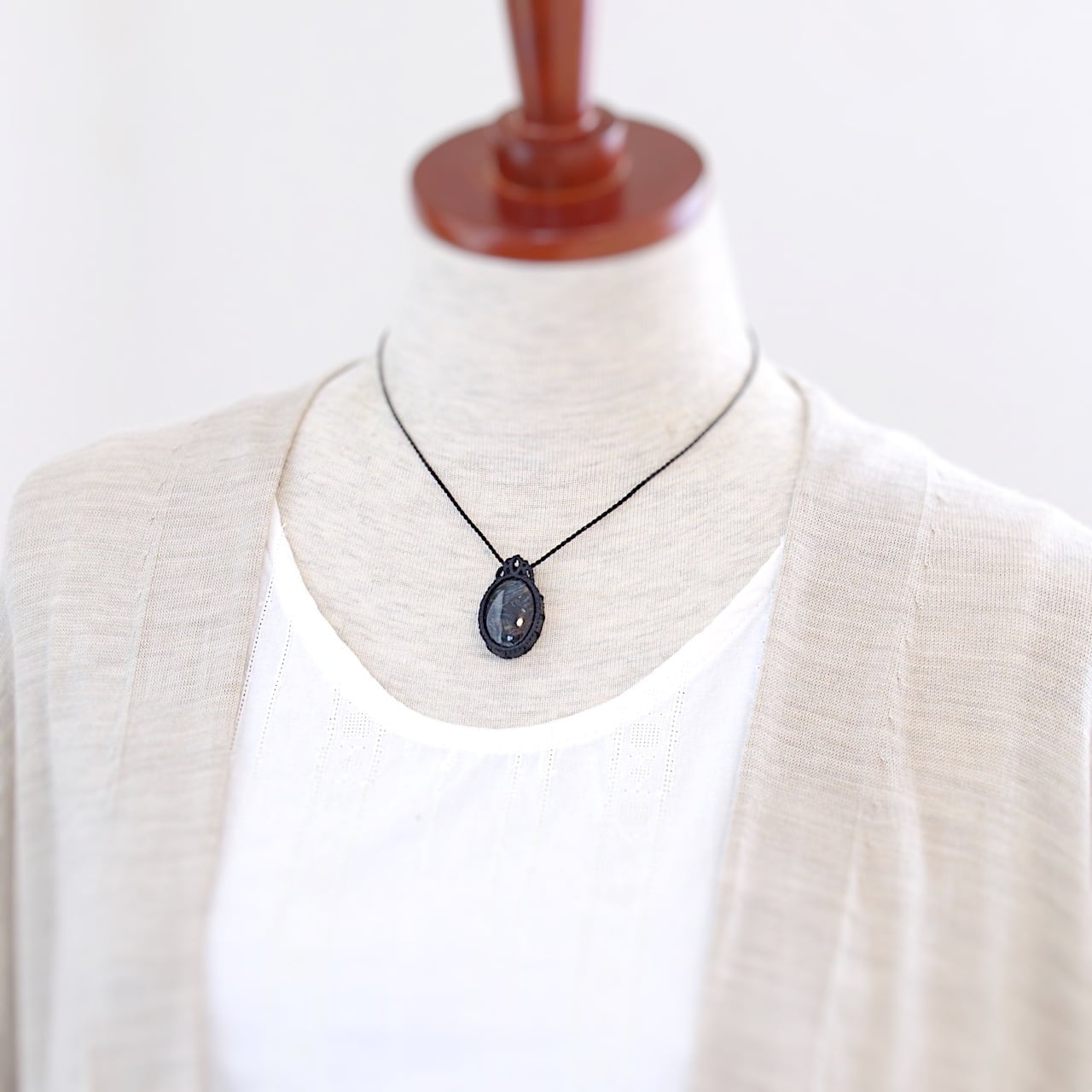 ヌーマイトのオーバルルースを包み込んだマクラメネックレスです。今回も黒い地色の中に、ヌーマイト特有の斜線の輝きが鮮やかで美しい石を選びました。特に青い輝きがあちらこちらに見られてとても綺麗!自然が作り出した神秘的な美しさは、石好きさんにはたまらない魅力です。