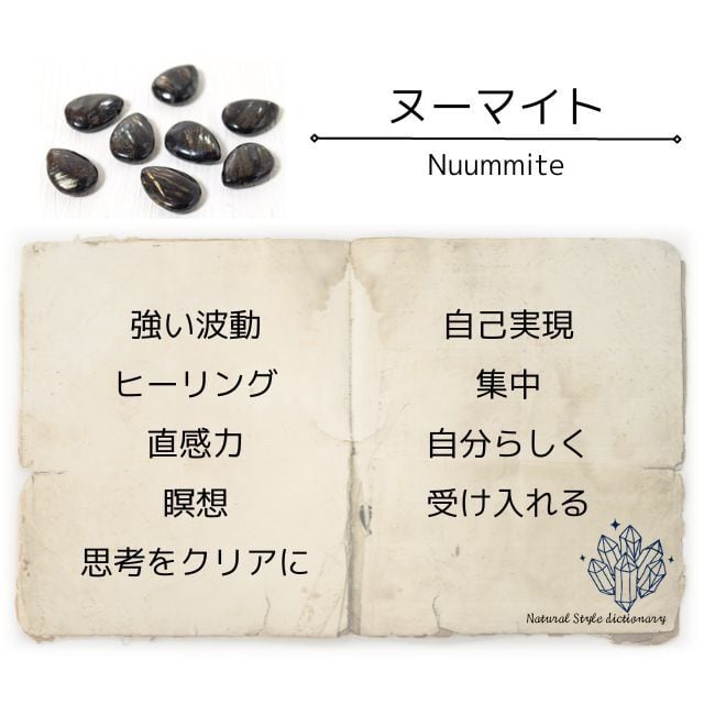 ヌーマイトは特に精神面に影響をもたらすヒーリングストーンです。身につけているとイライラした気分が静まって落ち着きます。じっと見つめていると、意識がクリアになり、直観力が高まるのを感じられるでしょう。そのため、瞑想などに用いられることもあるようです。