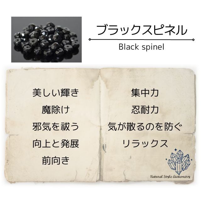 ブラックスピネルは思い込みやリミッターをはずし、希望や思考を自由に解き放ってくれます。自分の限界を決めているのは自分かもしれません。ブラックスピネルは、明晰な思考力を高め、目標に向かう意欲や継続する力を引き出してくれると言われています。そのため、気が散りやすい人や、物事が長続きしないという人、締め切りが近づくほど現実逃避してしまうという人にもお勧めです。