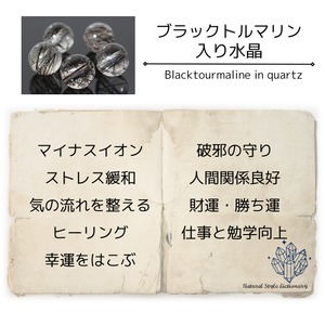 ブラックトルマリンやブラックトルマリン入り水晶は、実業家や社長、スポーツ選手などに大変人気のあるパワーストーンです。障害を取り除き、思わぬ幸運をもたらして、財運・勝ち運を招きよせると伝えられています。「運をはこぶ石」といわれ、古くは戦などにおいても、勝利をもたらすと信じられていました。この石を身につけると、強靭な精神力と忍耐力で物事を最後までやり遂げ、結果を出せるといわれています。仕事や勉強などの勝負所で力を借りるのも良いでしょう。