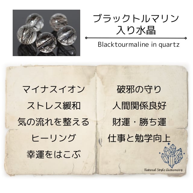 ブラックトルマリン入り水晶は、その名の通り、水晶の中にブラックトルマリンの柱状・針状結晶がインクルージョン(内包)された天然石です。「ブラックルチル」という名称で流通していることもあるようですが、ルチル(金紅石)ではありません。「トルマリンインクォーツ」「トルマリネーテッドクォーツ」という名称で呼ばれることもあります。 ブラックトルマリンは否定的なマイナスエネルギーや有害な思念をそらし、邪悪なものから身を守り、強力な盾となって持ち主を守ってくれると伝えられています。