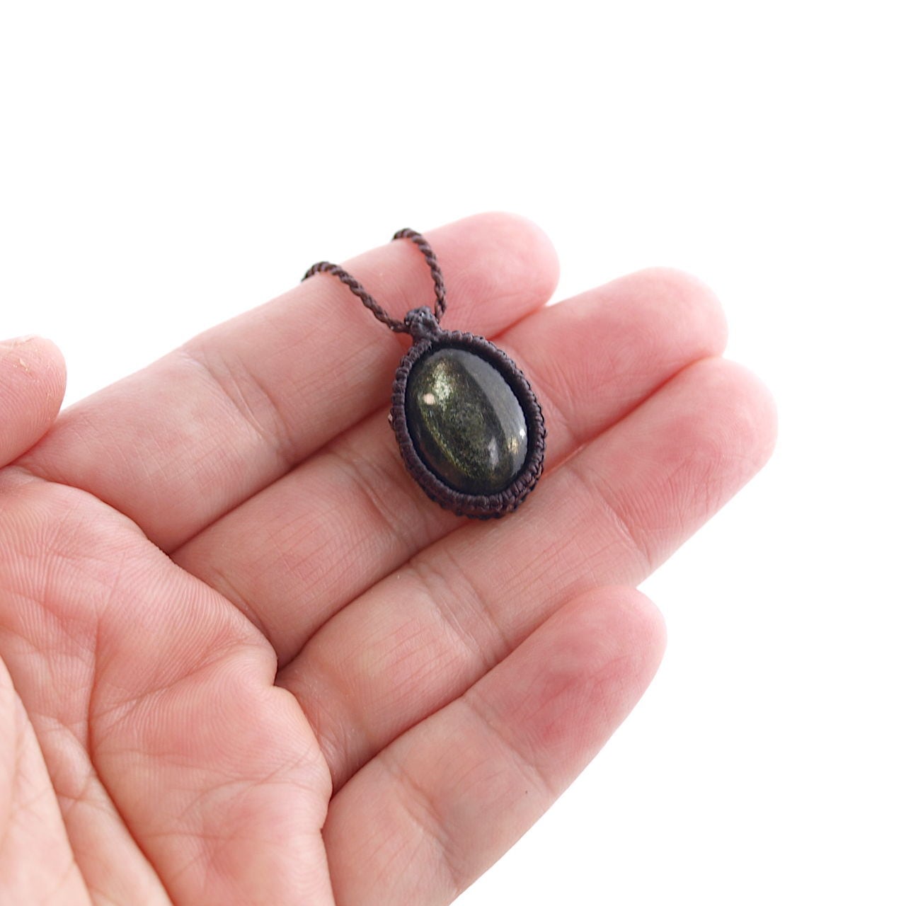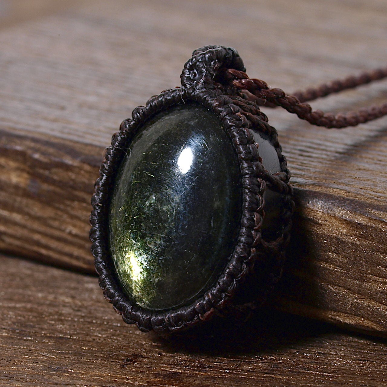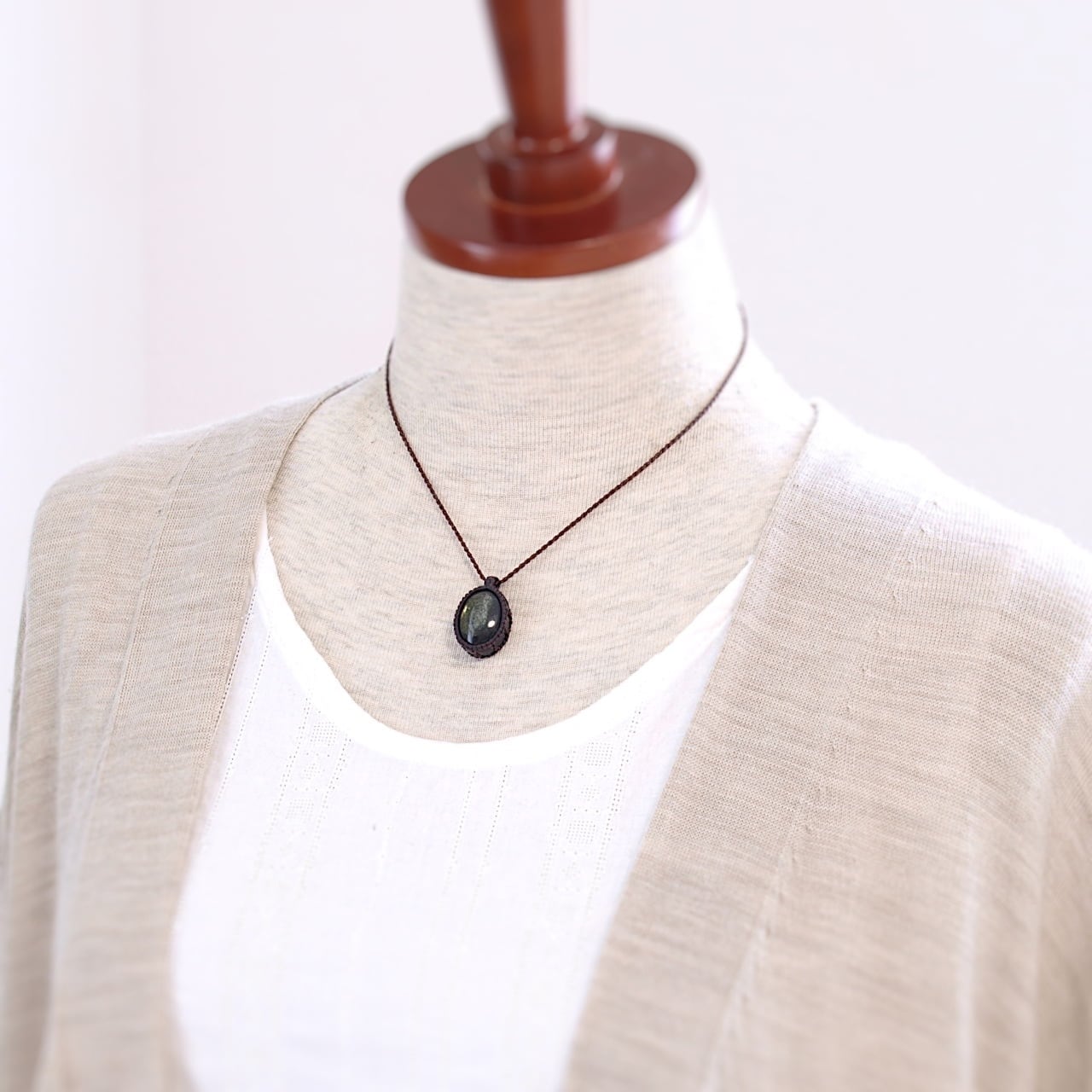 【一点物】グリーンマイカのオーバルルースを包んだマクラメネックレスNo.1