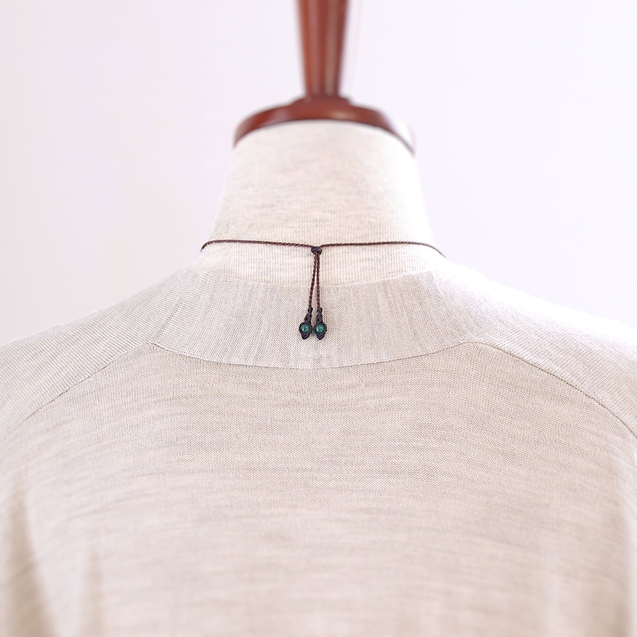 今回、ネックレス紐の飾り部分にグリーンアベンチュリンを編み込んでいますが、実はこの石、グリーンマイカと繋がりがあります。グリーンアベンチュリンの輝き(アベンチュレッセンス)はグリーンマイカの成分が元になっているのです。4ミリ玉なので、マイカ由来の輝きはそこまで感じられませんが、相性の良さや波動の繋がりは感じられるでしょう。