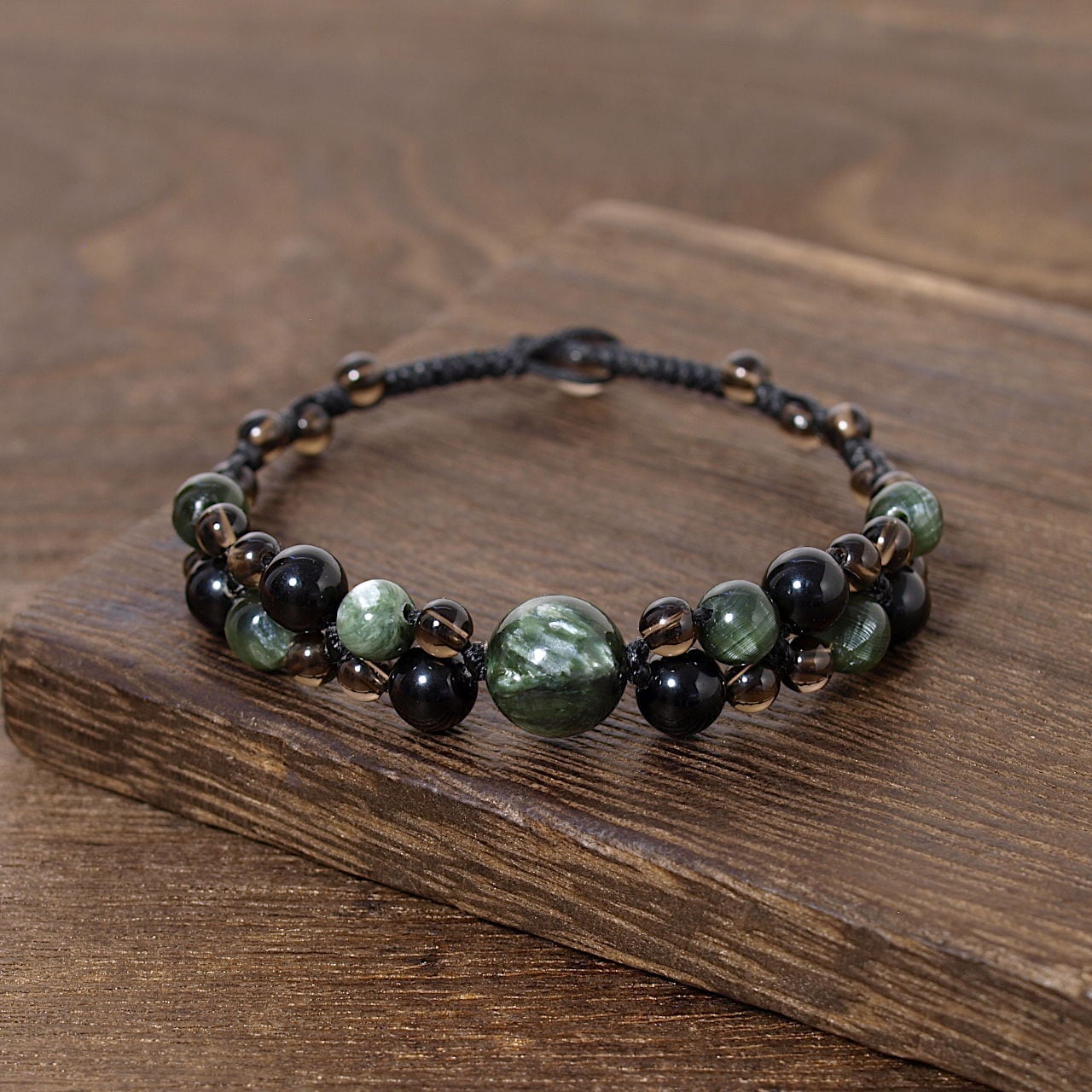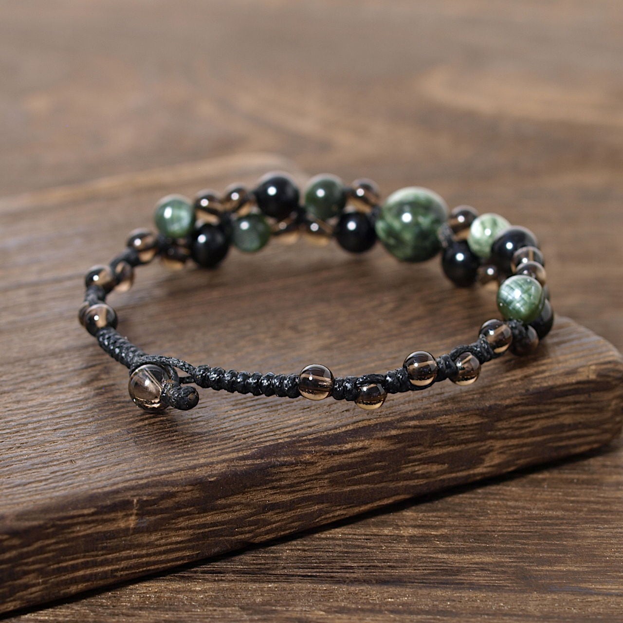 今回はNatual Styleでご紹介しているブレスレットの中で、TOP3に入る超人気の組み合わせ!セラフィナイトとモリオン、スモーキークォーツを合わせて作りました。どれも守護や魔除けの石として知られるパワーストーンです。どれか1つでもお守りには十分ですが、組み合わせるとさらに良い効果を得られます。特にグラウンディングを助ける効果が高まり、精神の安定やセルフヒーリング、瞑想などにも活用できるでしょう。