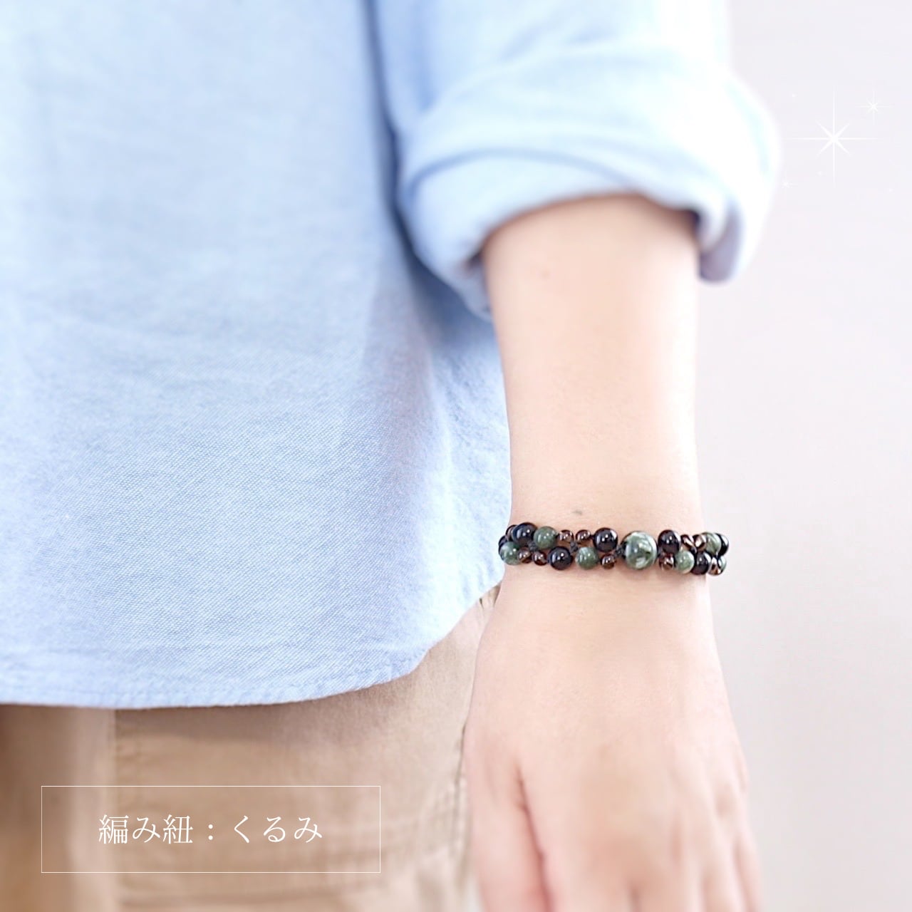 お客様の手首サイズに合わせて、お好きな紐色で制作いたします。編み込む石の数は手首サイズによって増減することがあります。
