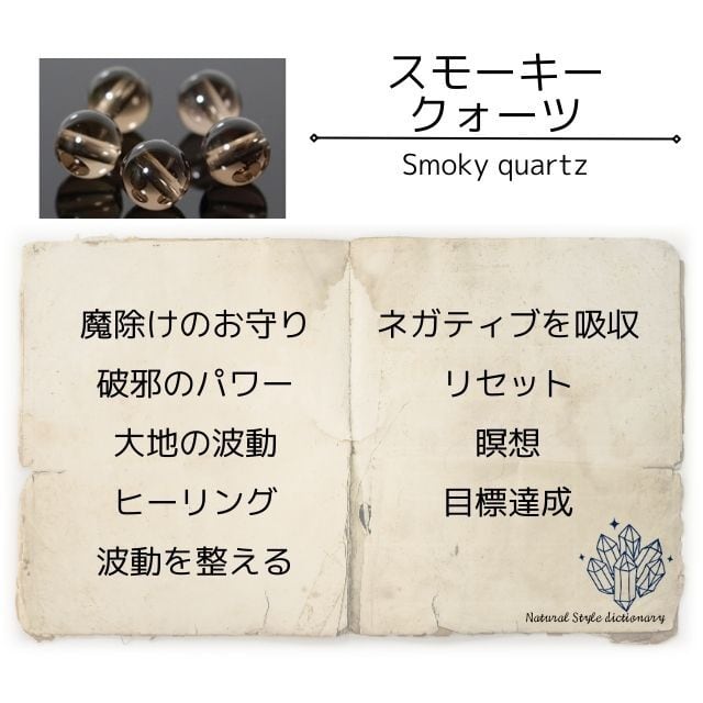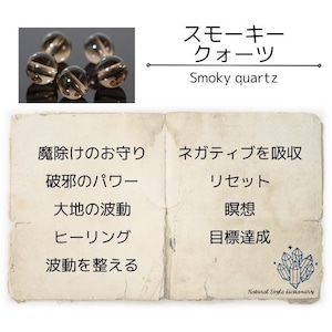 和名「煙水晶」という名前の通り、茶色~茶黒色をした水晶です。この石は古来より魔除けとして用いられてきました。浄化作用の高い水晶系の石の中でも特に破邪のパワーが強く、古代ローマやケルト民族の間では、悪魔祓いや厄除けのお守りとしてスモーキークォーツを使っていたそうです。マイナスエネルギーやネガティブな波動を吸収し、強い守護力で持ち主を守ってくれると伝えられています。そのため他のパワーストーンに比べて、少しこまめに浄化をしてあげた方が良いようです。