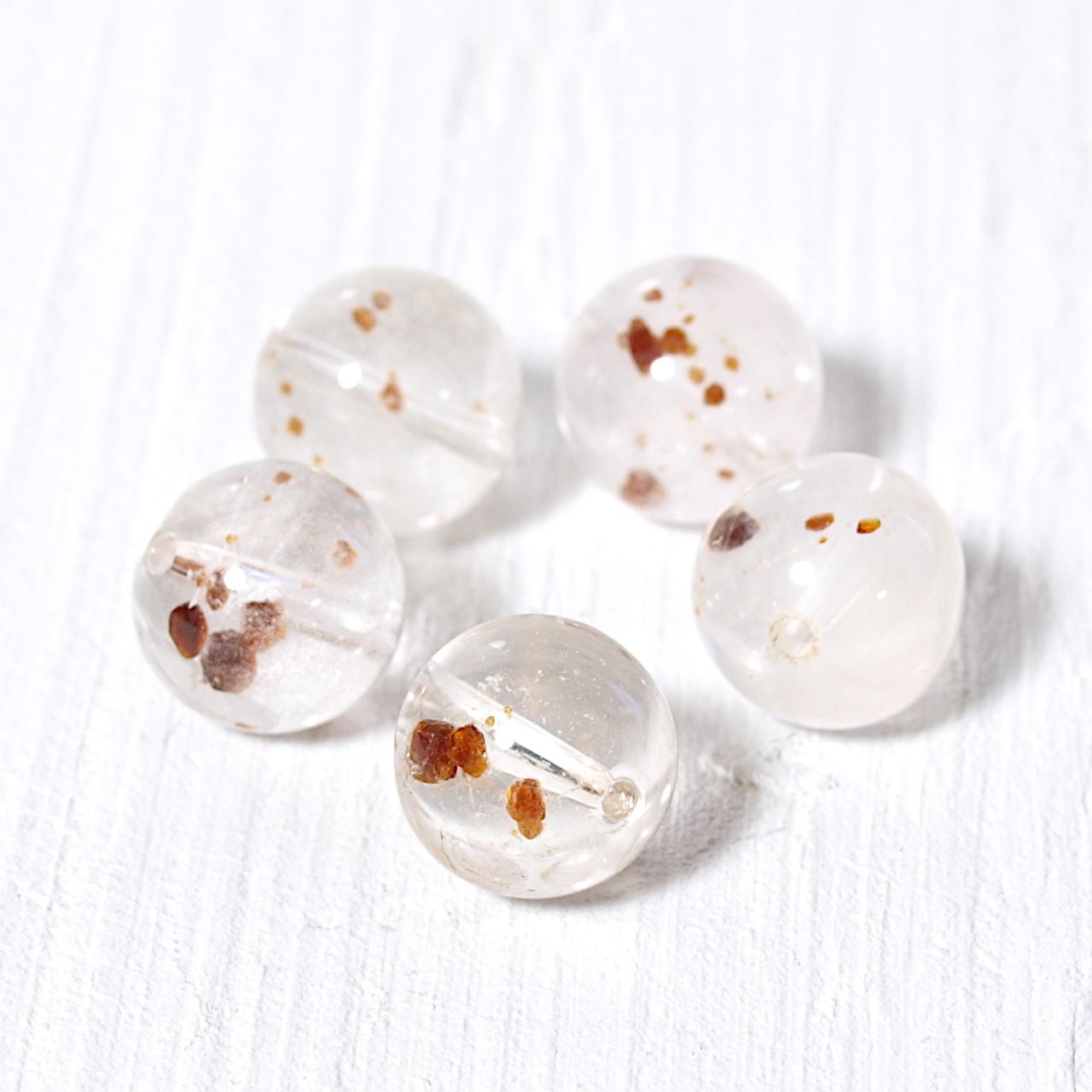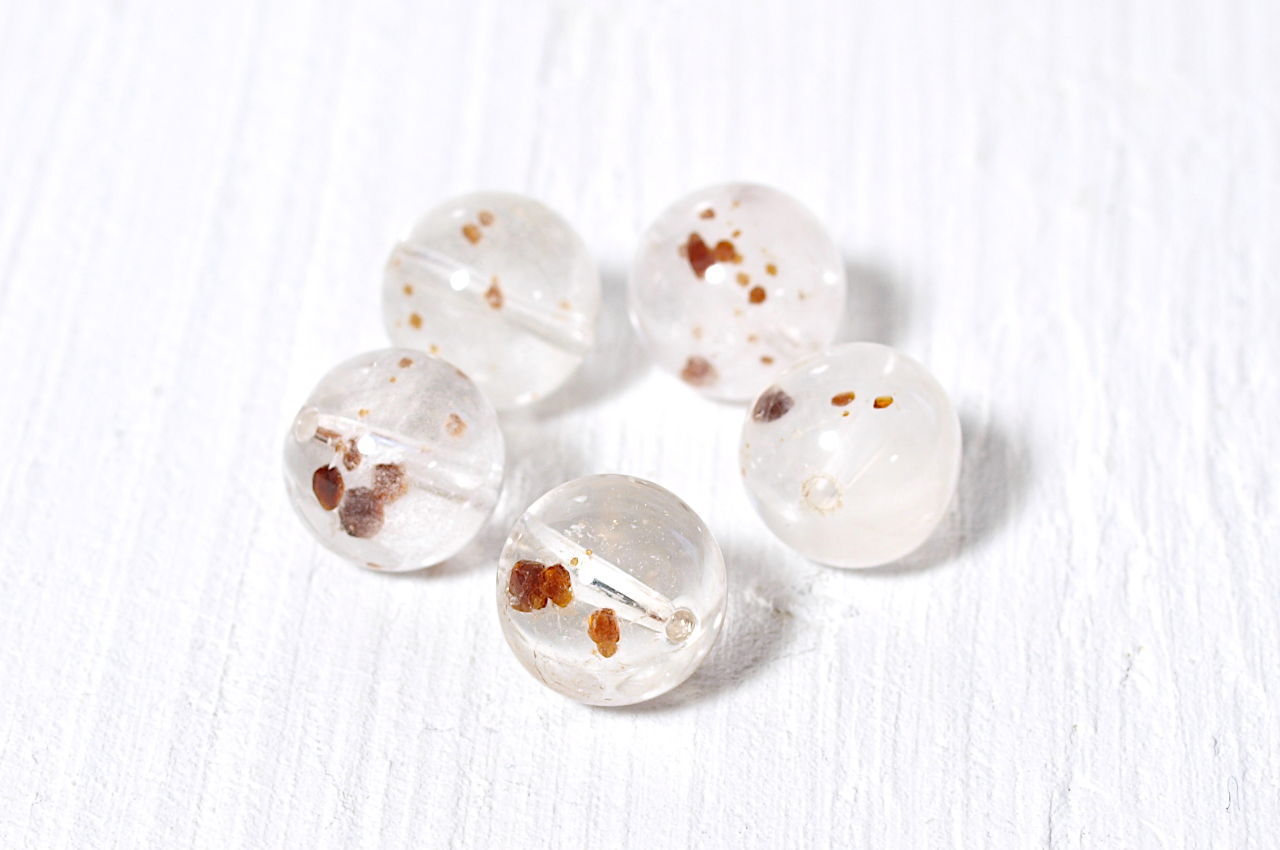 水晶の中にガーネットの結晶が内包された天然石です。自然に形成された原石を研磨しているため、粒によってガーネット結晶の色や大きさ、結晶の数などが異なります。できるだけ品質差の少ない石を集めてはいますが、個体差はあらかじめご了承ください。
