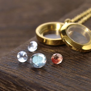 実はこのケース、前後がねじ込み式で開くようになっているので、石を入れ替えることもできます。お手持ちの石を入れたり、中身を入れ替えたりしながら、お好きな使い方を探してみてください。収納可能なのは厚さ3mmぐらいまでの小さな天然石。小さな丸玉やボタンカットなど、形の違う石を組み合わせるのも素敵です。