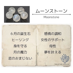 ムーンストーンは様々な変化に合わせて調子を整え、心を解きほぐして、大らかな気持ちにさせてくれるヒーリングストーンです。一見繊細そうに見える石ですが、実はとても自浄能力が高く、周囲の雑音や悪影響を受けにくいので、どんな状況でも安らぎと癒しの波動を絶やさず、情緒的なバランスを良い状態へと導き、保ってくれるでしょう。