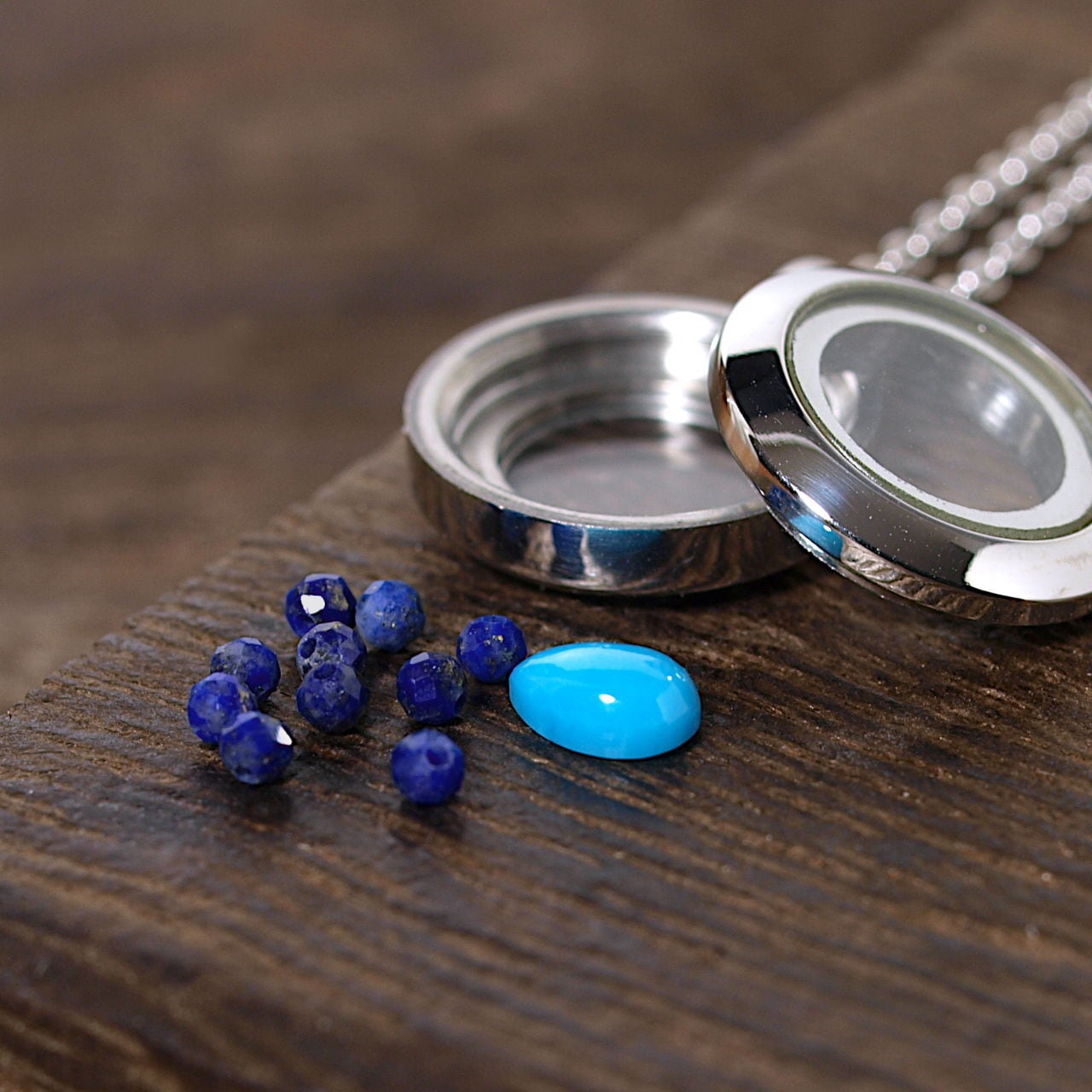 実はこのケース、前後がねじ込み式で開くようになっているので、石を入れ替えることもできます。お手持ちの石を入れたり、中身を入れ替えたりしながら、お好きな使い方を探してみてください。収納可能なのは厚さ3mmぐらいまでの小さな天然石。小さな丸玉やボタンカットなど、形の違う石を組み合わせるのも素敵です。