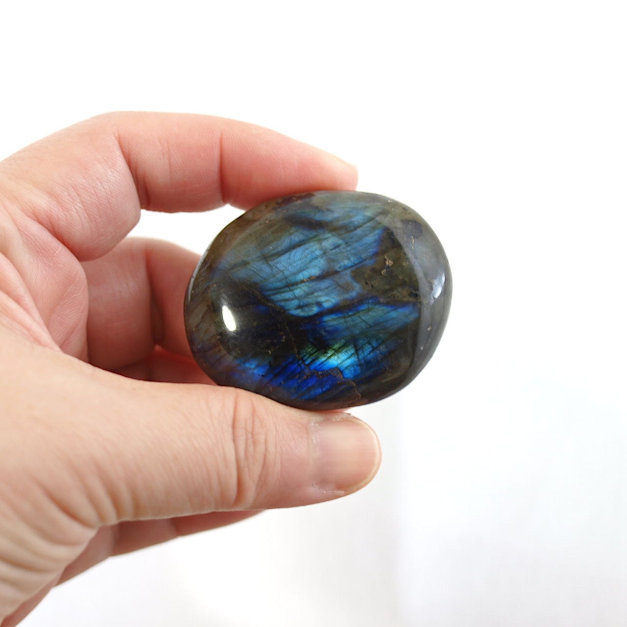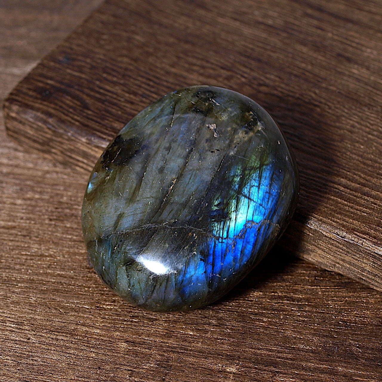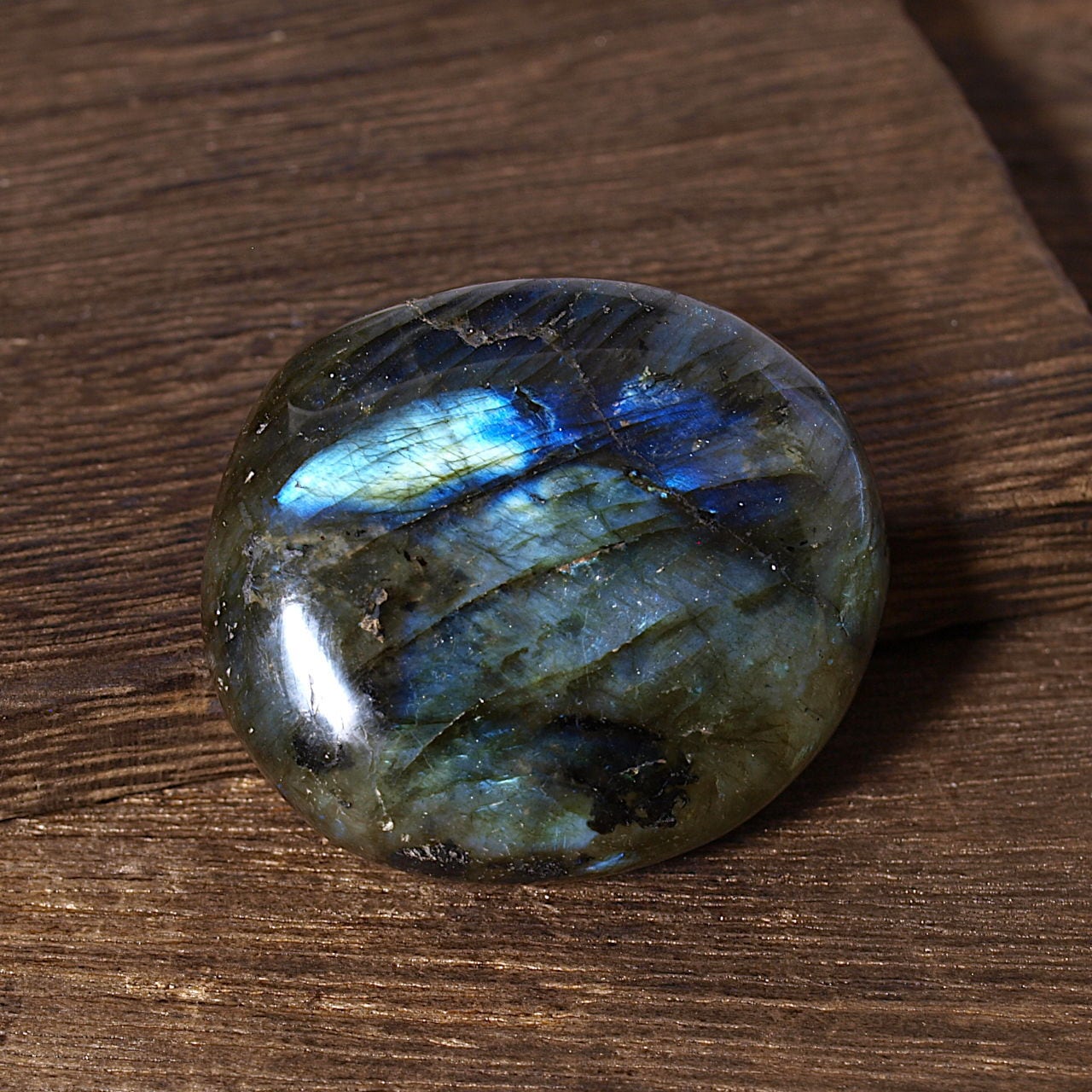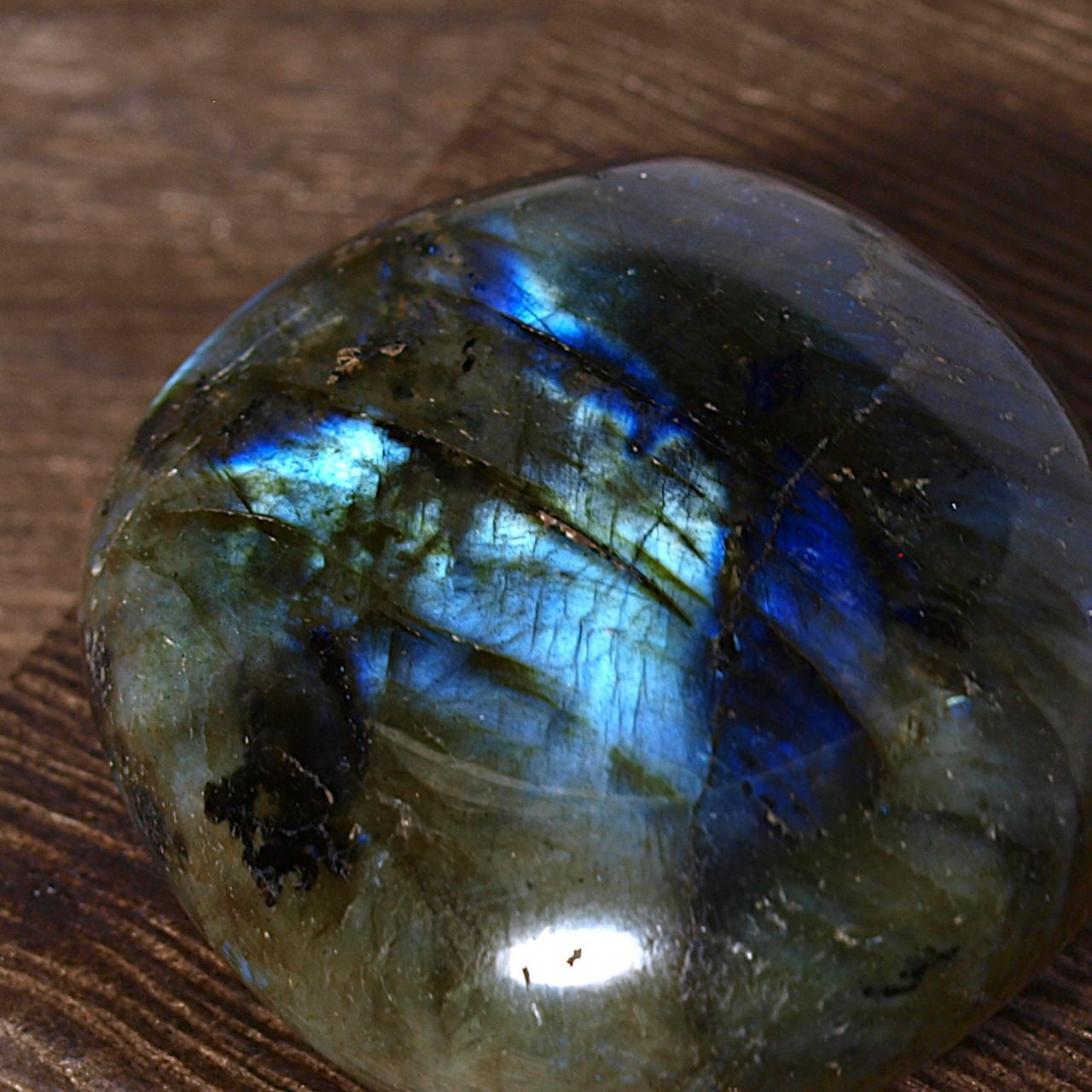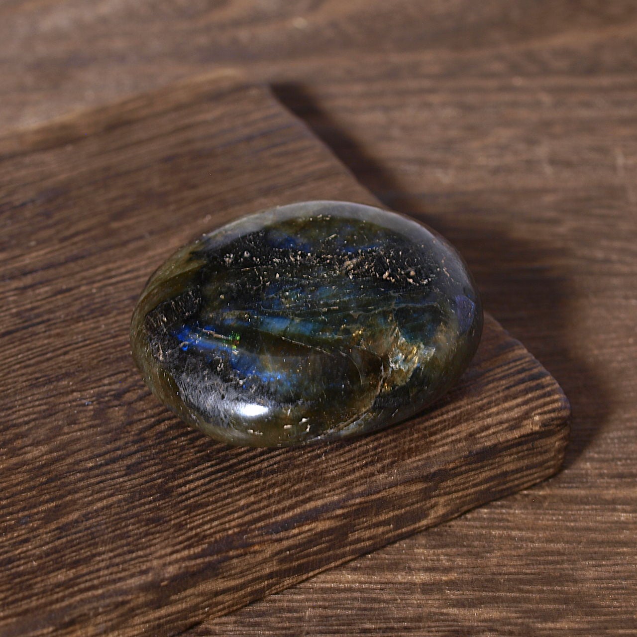 表面を研磨しただけの素朴なタンブルは、加工しすぎていないからこそ、ラブラドライト本来の神秘的で自由な波動がよりダイレクトに伝わってくる気がします。リビングの飾り棚や玄関、ベッドサイドやデスクの上など、お気に入りの場所においてみてください。そっと手に取って触れるたびに、心身のバランスやバイオリズムを整えてくれるでしょう。持ち運びに便利な小さな布製ポーチをおつけしますので、(ちょっと重いかもしれませんが)バッグに入れてお守りとして持ち歩くこともできます。