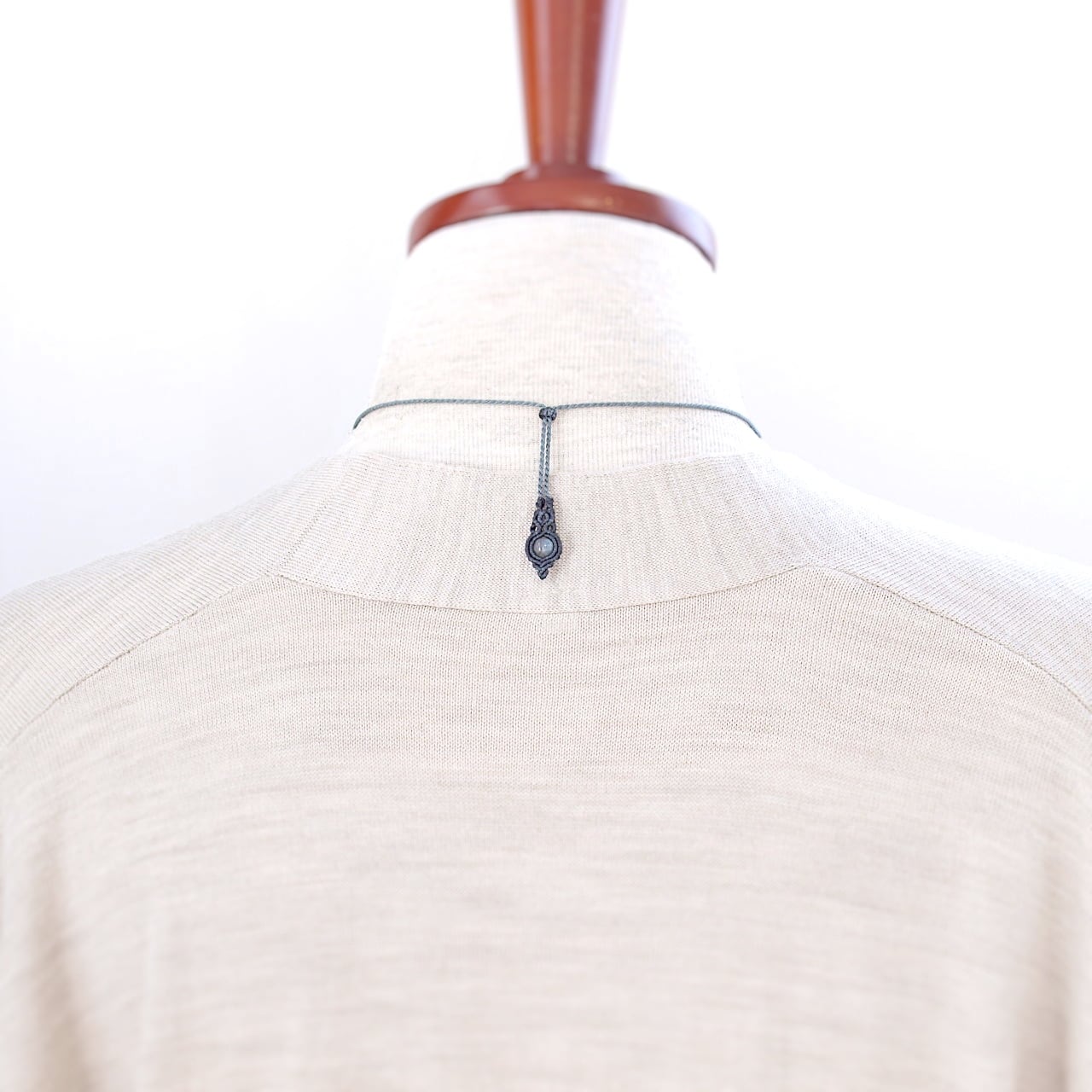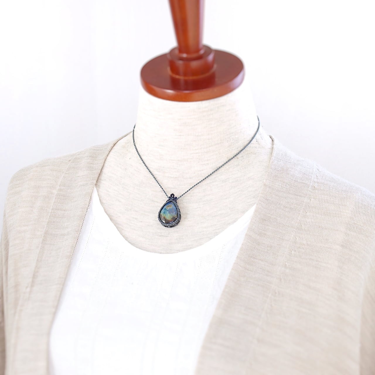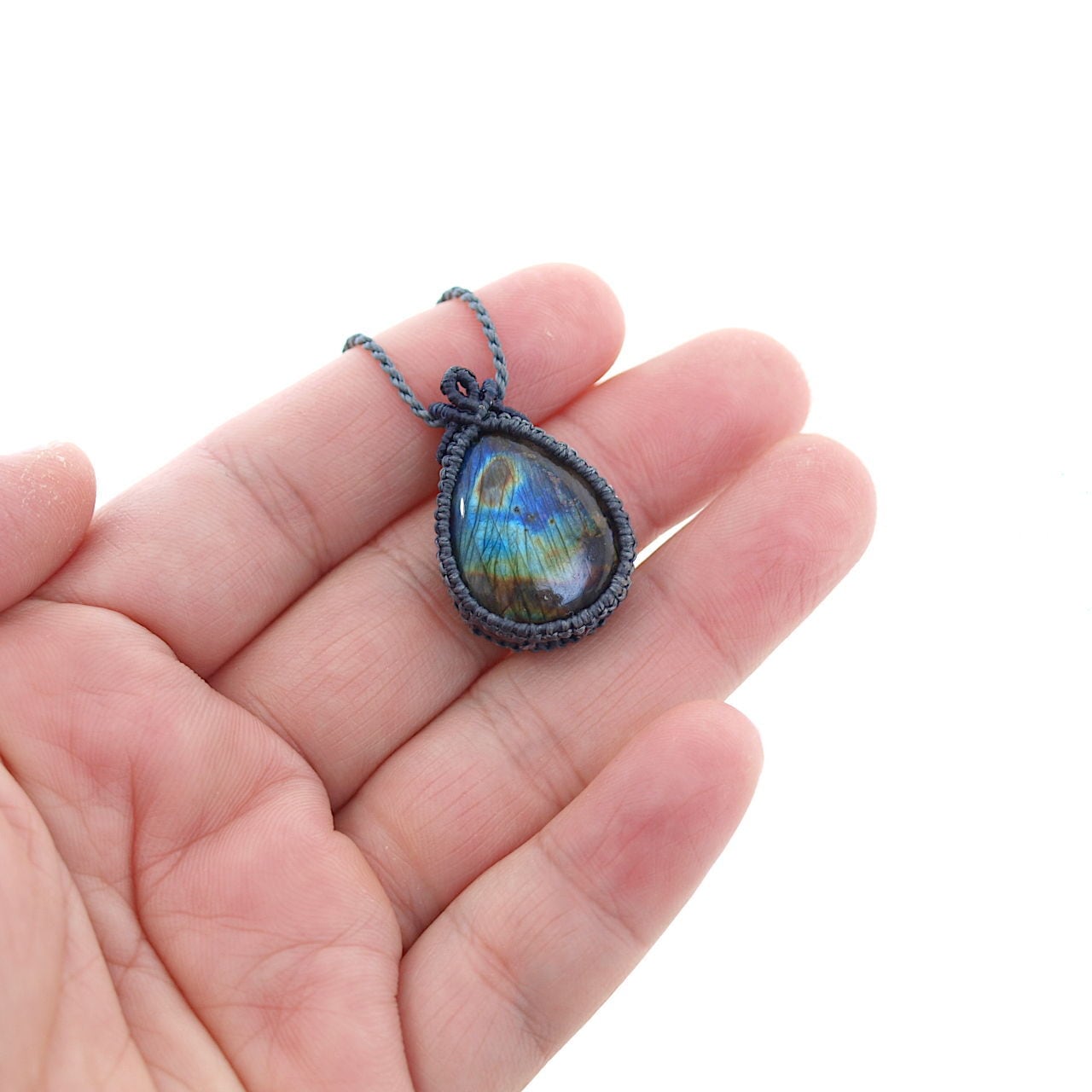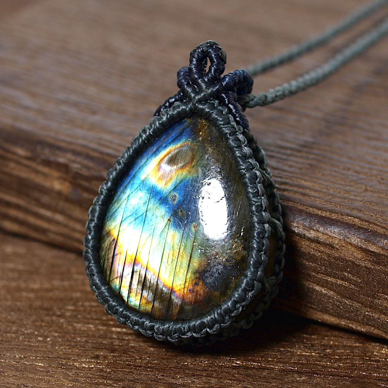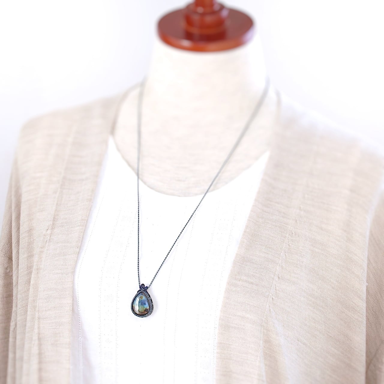 【一点物】ラブラドライトのドロップルースを包んだマクラメネックレスNo.18