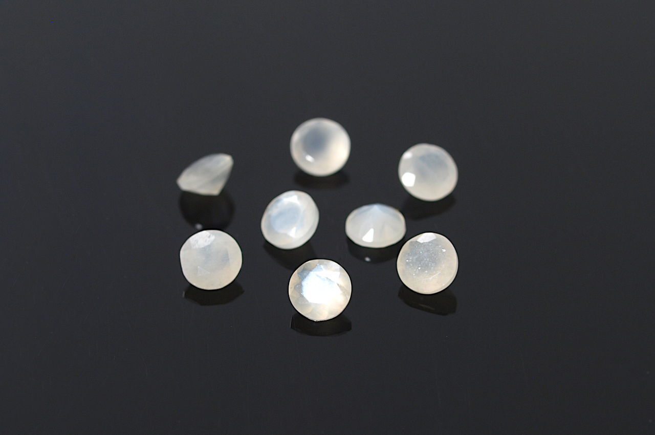 グレードAAA−。真っ白というよりも、ほんのりベージュがかった乳白色で、肌なじみの良い優しい色あいです。ファセットカットの多面的な輝きが石の美しさを引き出しています。粒によっては小さなクラックが見られるものもありますが、原石に由来するもので傷や不良ではありません。