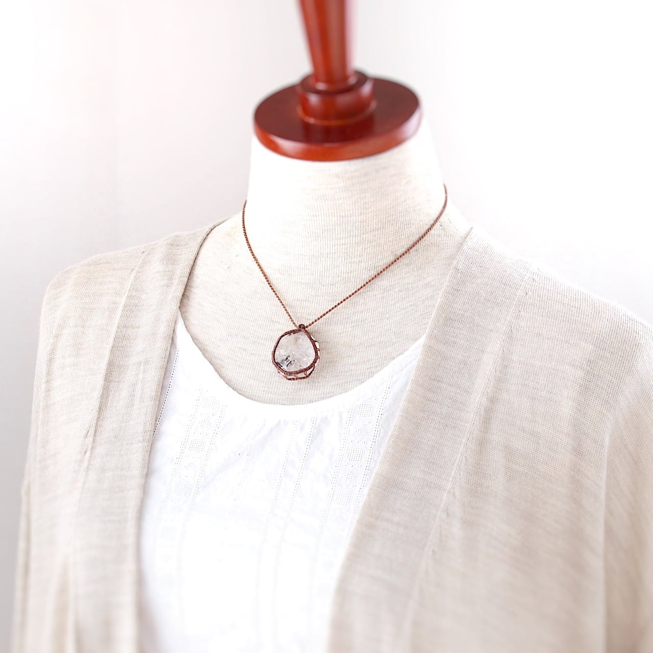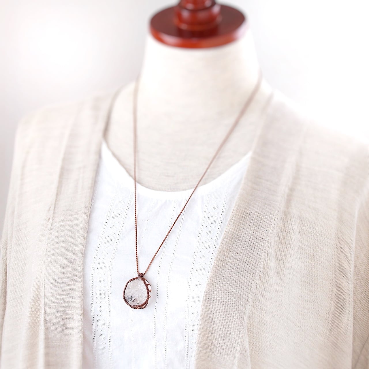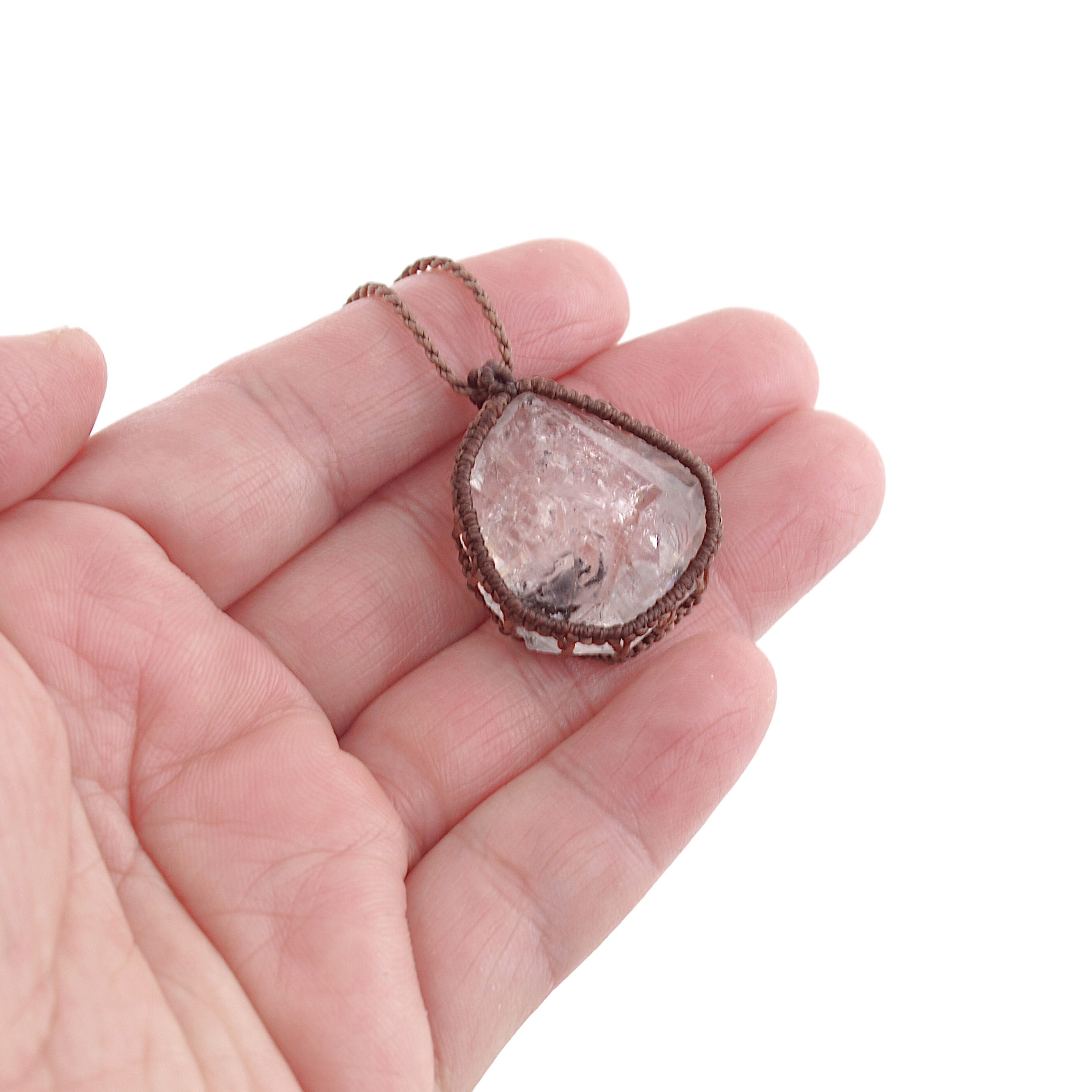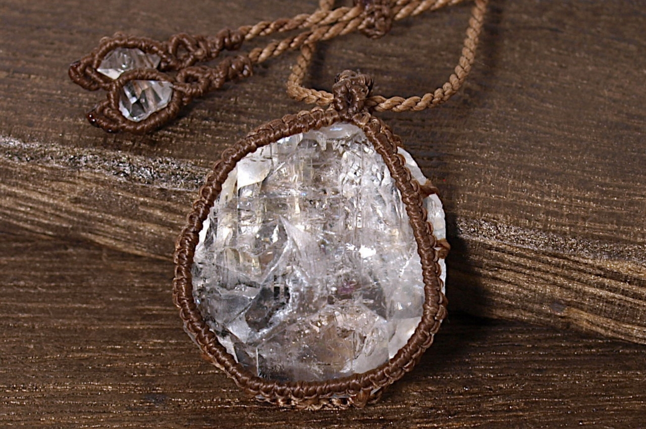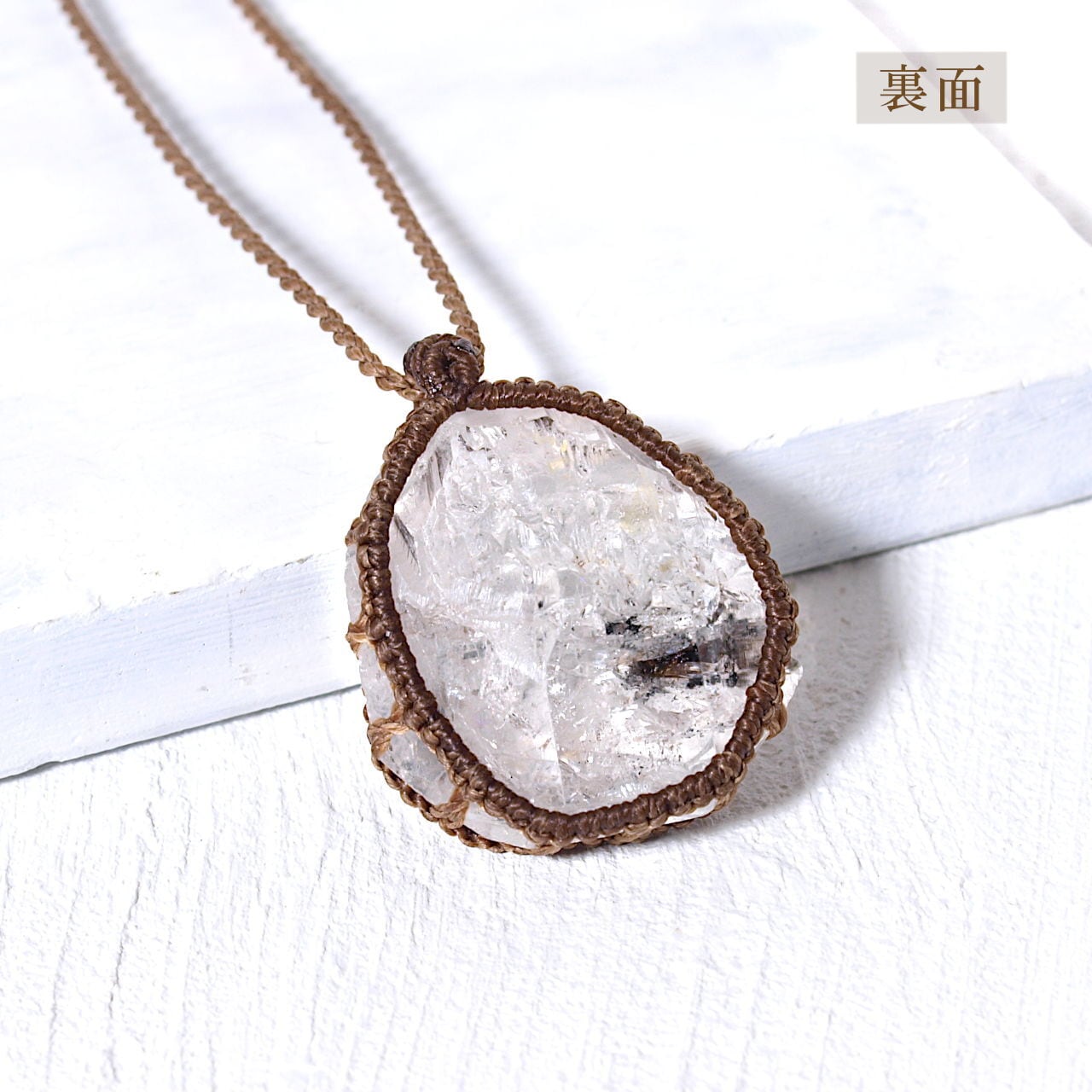 ハーキマーダイヤモンドはルースのように整った形ではないため、マクラメの編み目が歪曲した部分もあります。あらかじめご了承ください。ですが、石の形に合わせて自由に石を包めるところもマクラメも魅力だと思います。