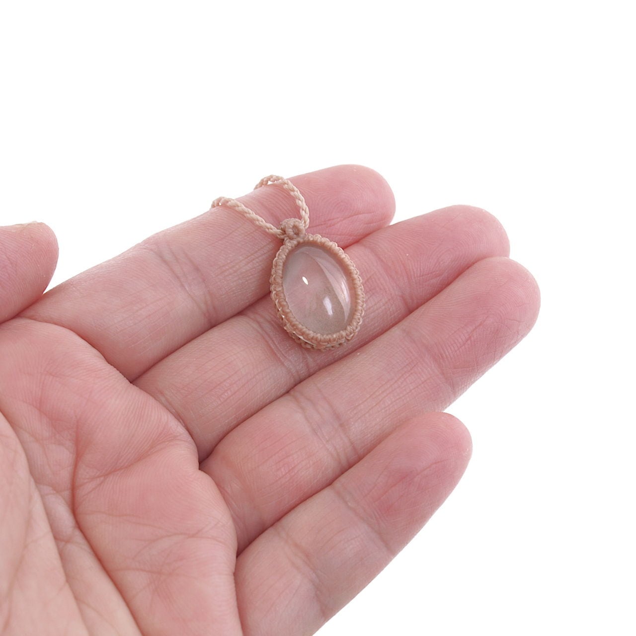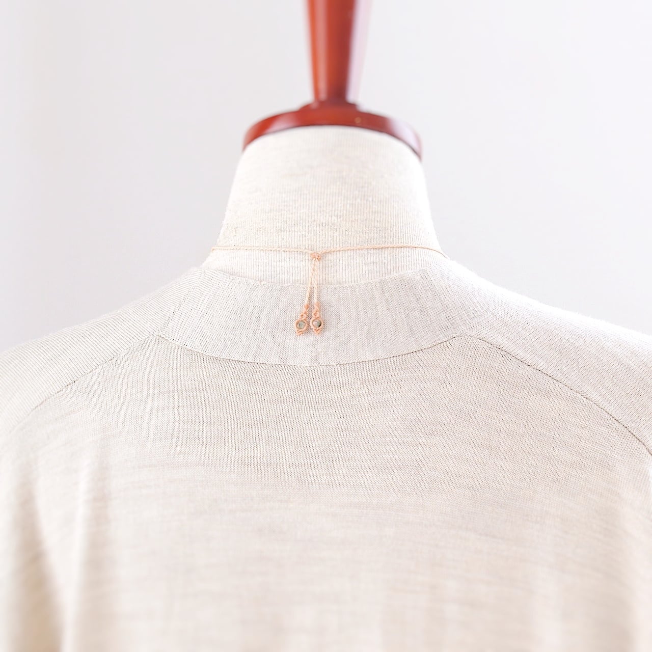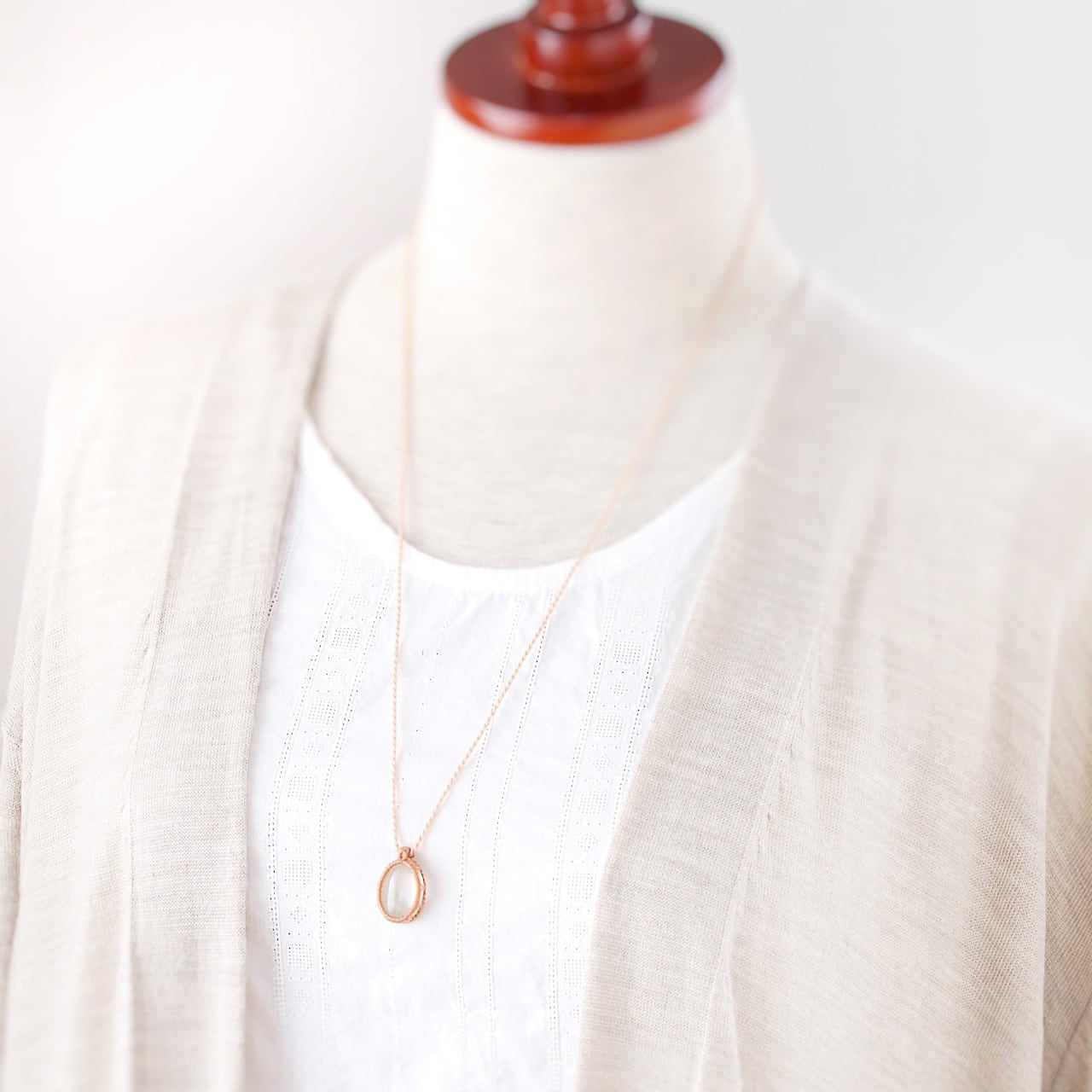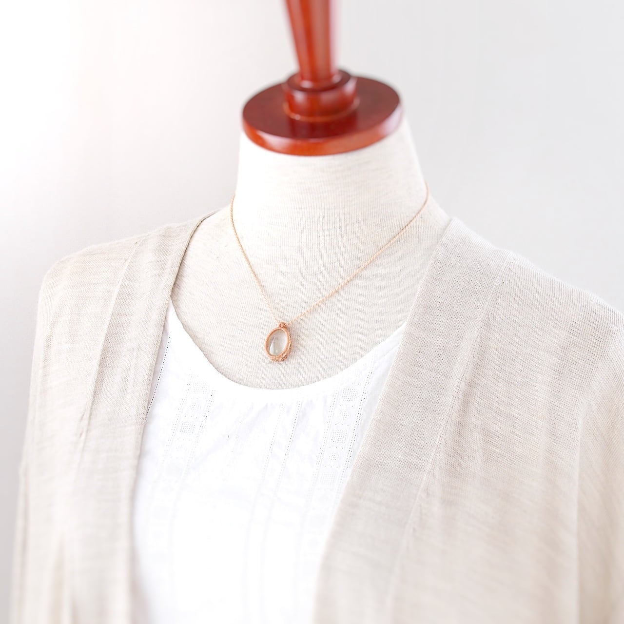 ガーデンクォーツのオーバルルースを包み込んだマクラメネックレスです。今回選んだ石は透明度が高く、グリーンの内包物が細かく散りばめられています。ここまでクリアなガーデンクォーツはとても希少です。緑や茶色の内包物に加えて、肉眼では見えないような微細な内包物が光を受けてシラーのように美しく輝いています。