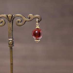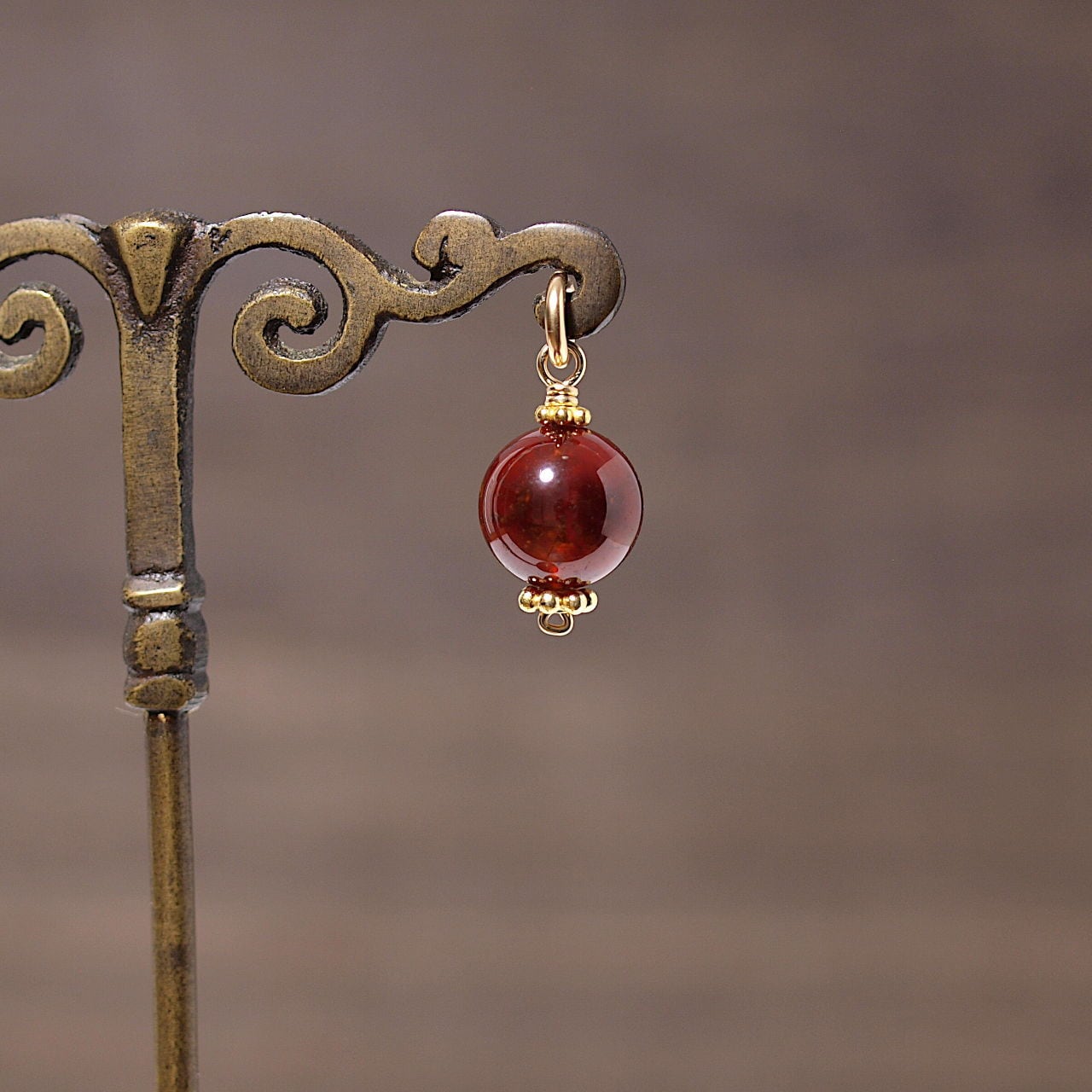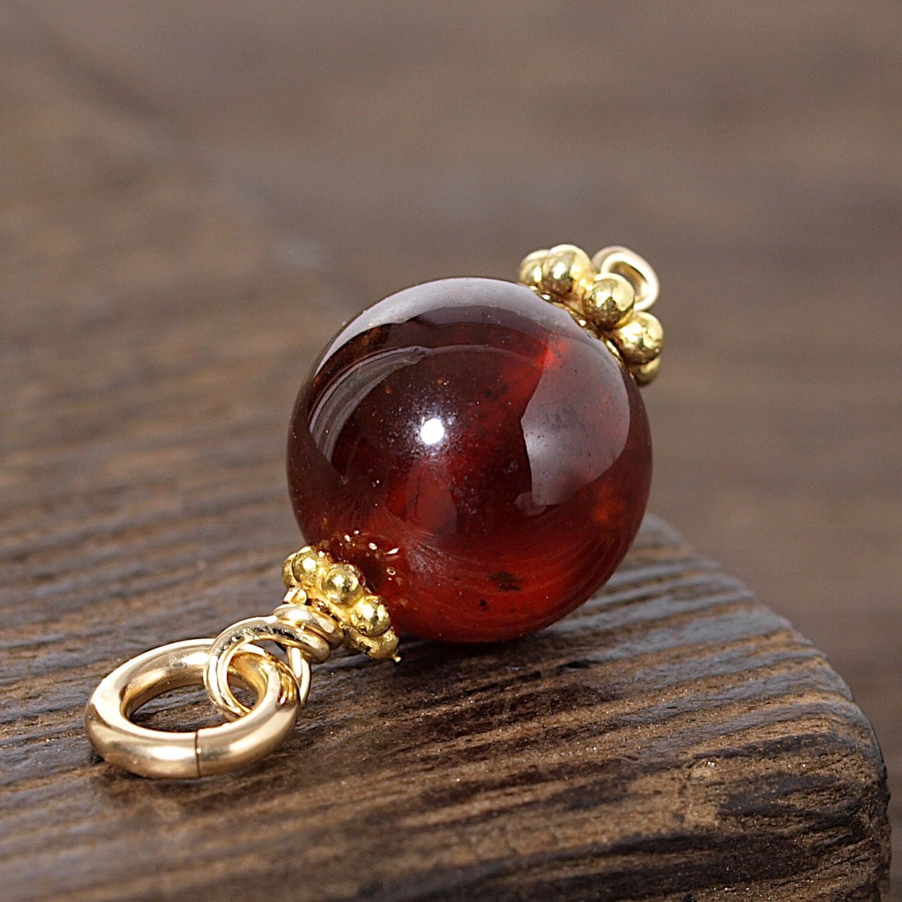 この石はガーネットの一種で、グロッシュラーガーネット(またはグロッシュラーライト)の中で、オレンジ~赤褐色の石をヘソナイトと呼びます。ガーネットは、歴史上最も古い宝石のひとつで、生命力・情熱・実りを象徴する魔よけのお守りとして大切にされていました。中でもヘソナイトは魔除けの効果が高い石として知られています。