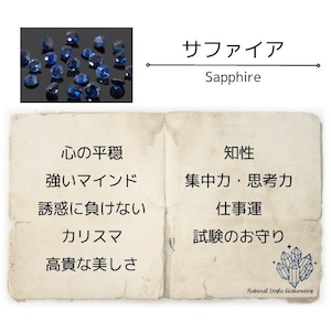 サファイアを身に着けると、思考力や集中力、直感が高まり、人の意見や感情に振り回されず、冷静な判断ができるようになるといわれています。仕事運やカリスマ性、信頼性を向上させる英知の石。知的好奇心を刺激し、物事を最後までやり抜く強い意志を与えてくれるので、受験や転職など、人生の転機を支えてくれるサポートストーンとしてもお勧めです。