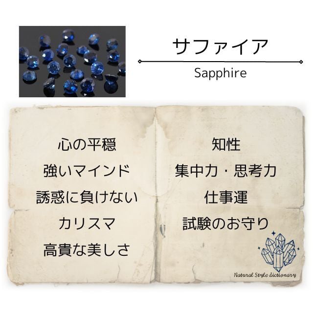 サファイアを身に着けると、思考力や集中力、直感が高まり、人の意見や感情に振り回されず、冷静な判断ができるようになるといわれています。仕事運やカリスマ性、信頼性を向上させる英知の石。知的好奇心を刺激し、物事を最後までやり抜く強い意志を与えてくれるので、受験や転職など、人生の転機を支えてくれるサポートストーンとしてもお勧めです。