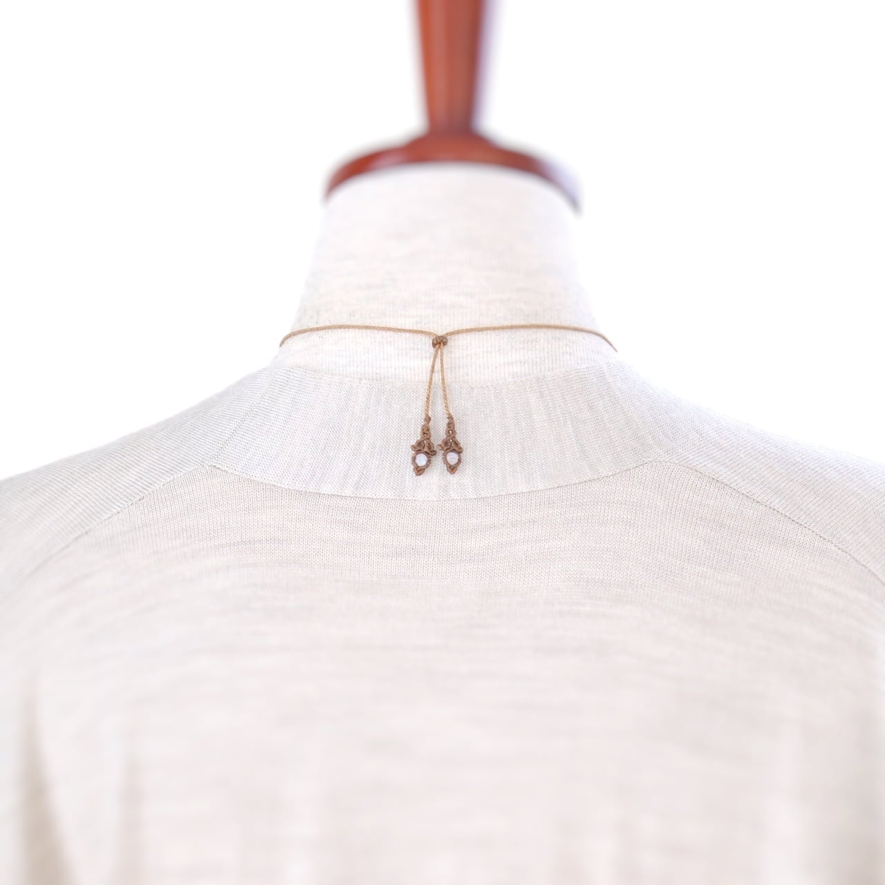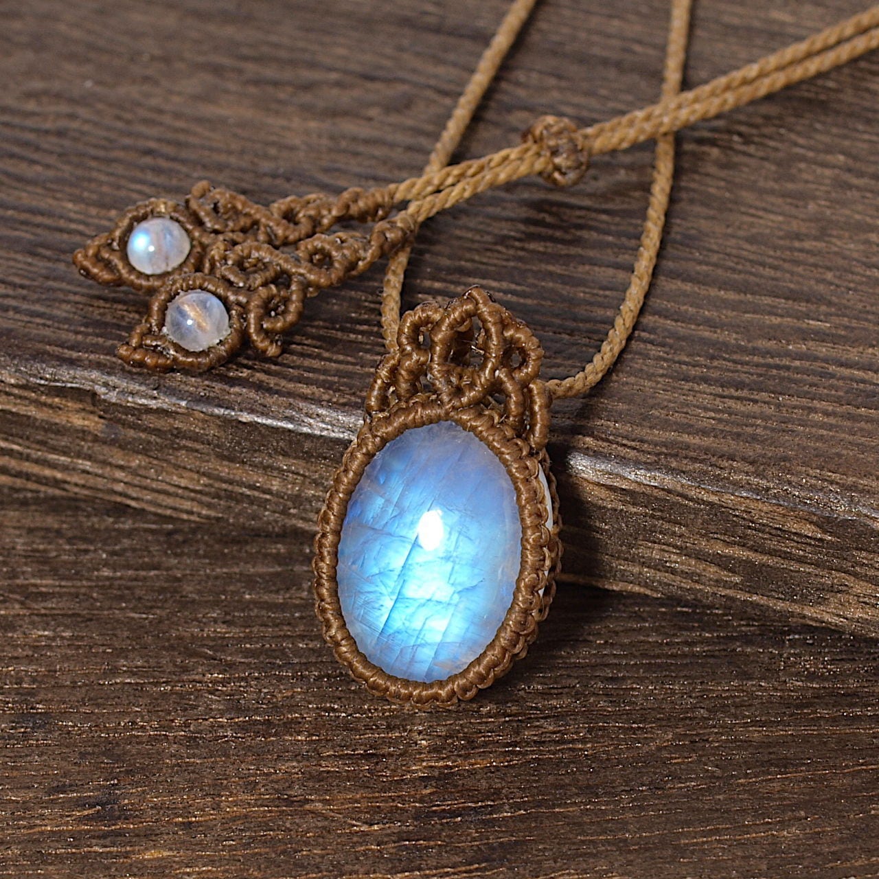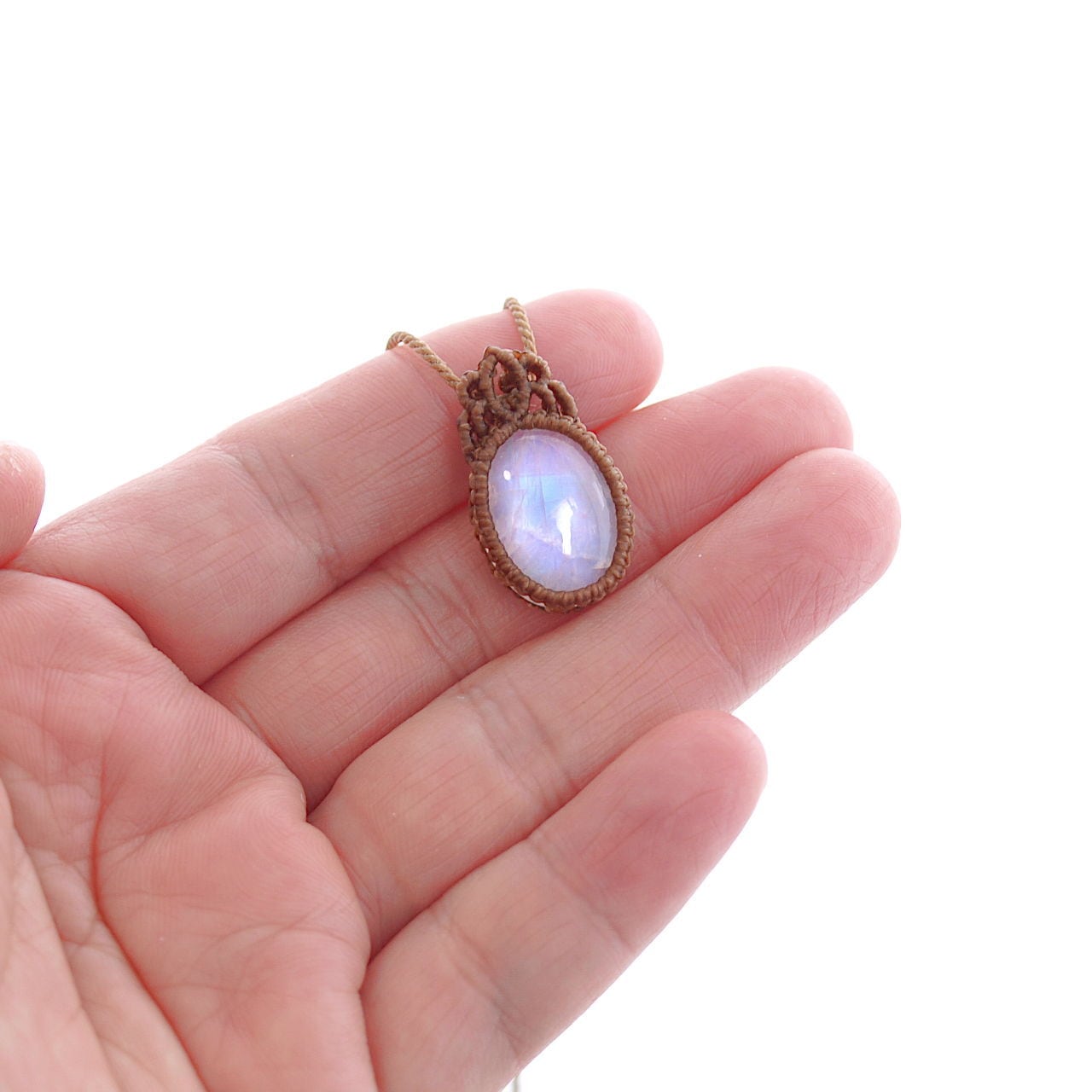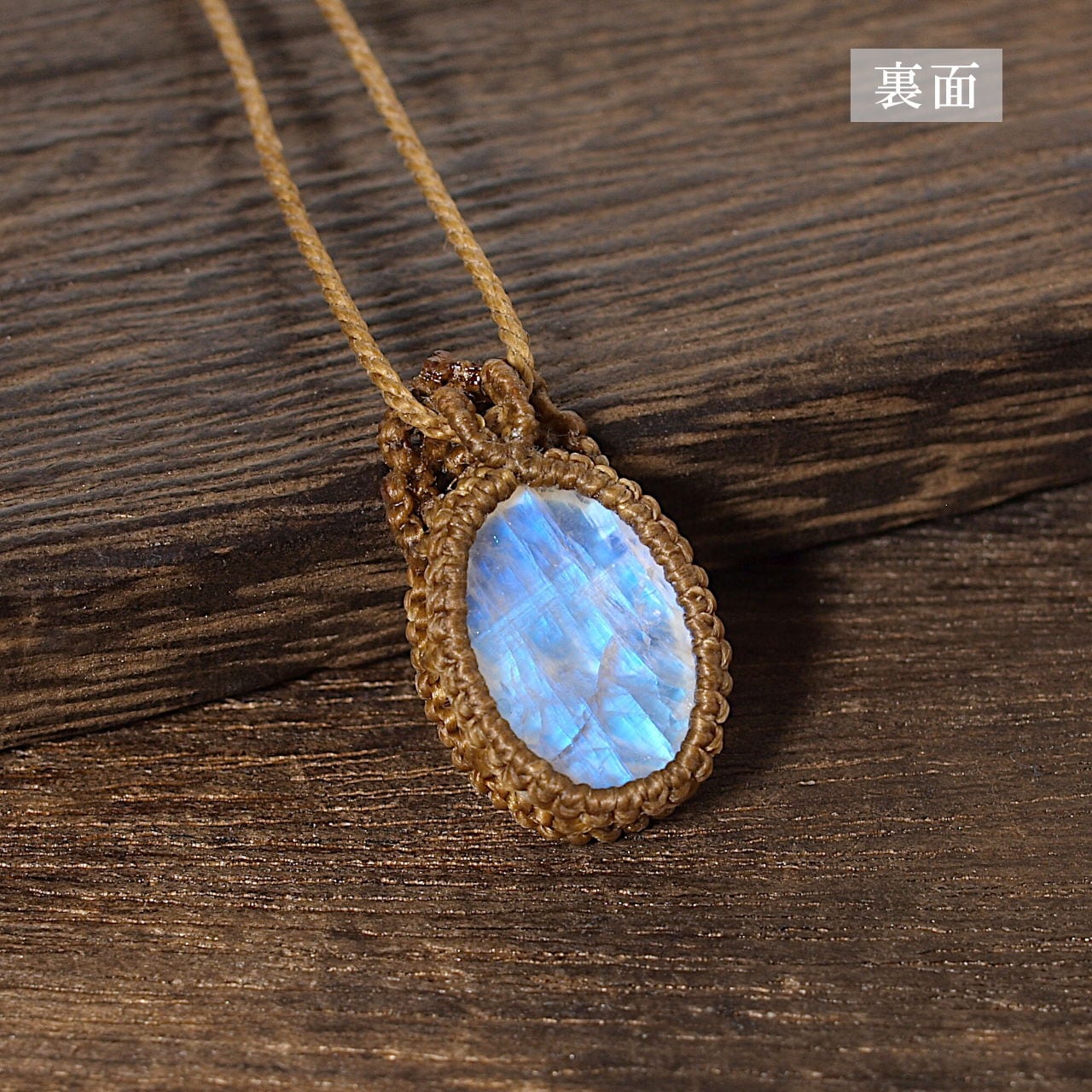 【一点物】レインボームーンストーンのオーバルルースを包み込んだマクラメネックレスNo.8