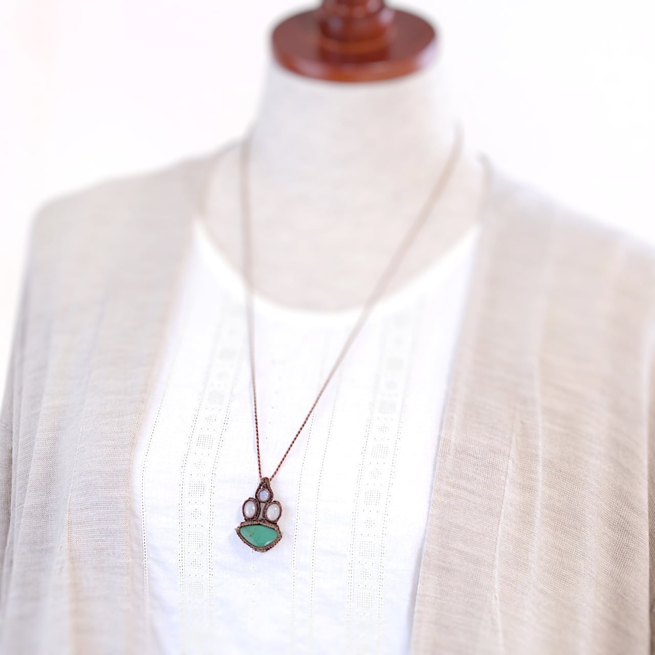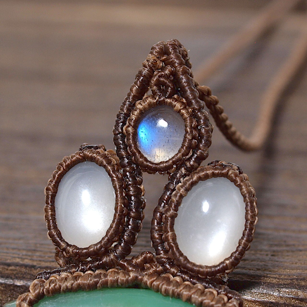 【一点物】ペリステライト+ムーンストーン+クリソプレーズ連結マクラメネックレス