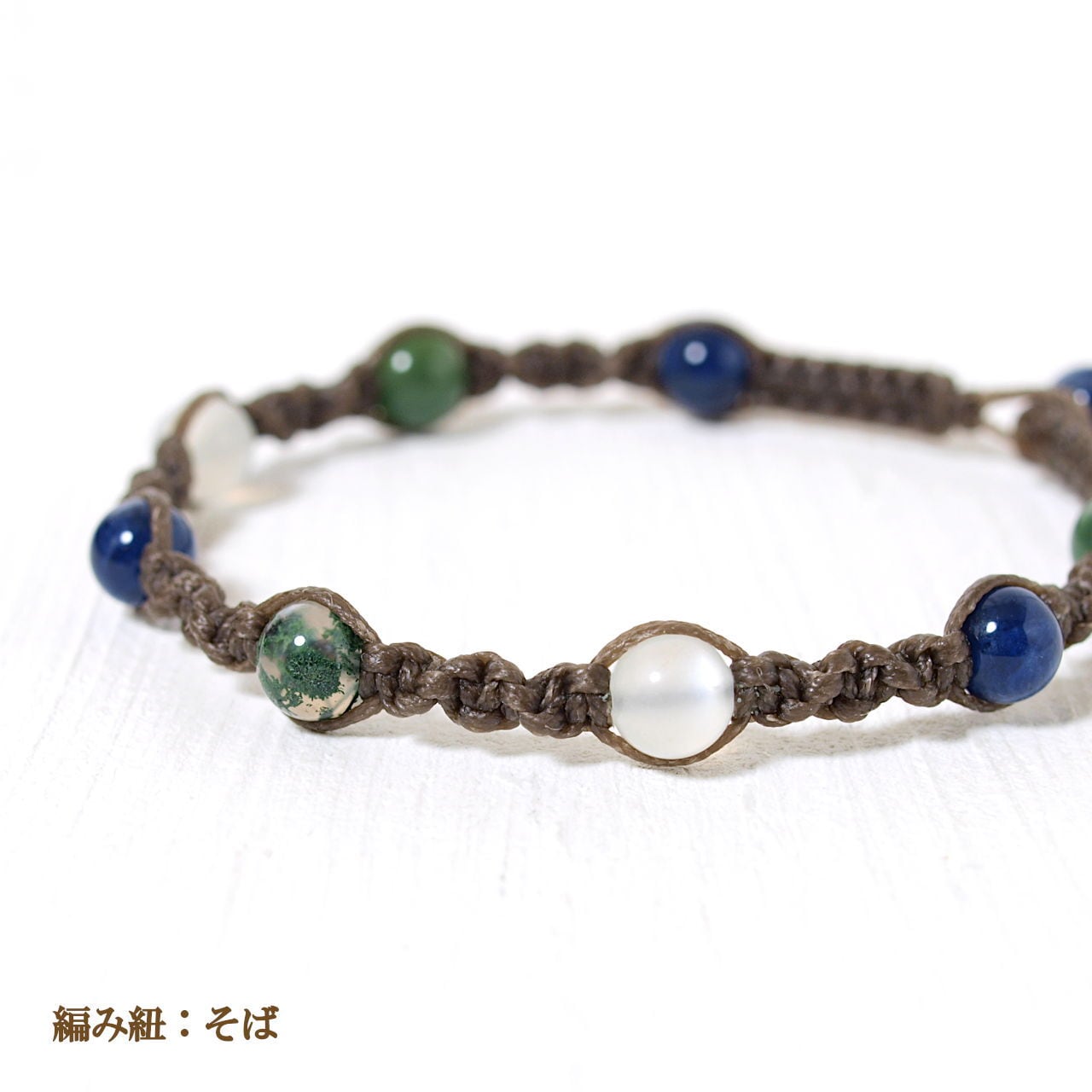 お客様の手首サイズに合わせて、お好きな紐色で制作いたします。編み込む石の数は手首サイズによって増減することがあります。