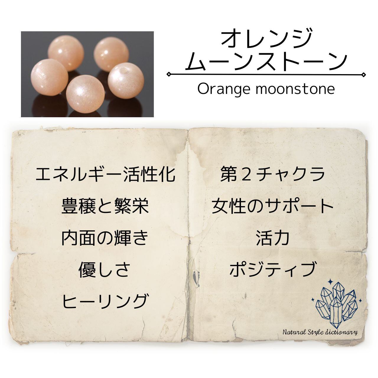 オレンジムーンストーンは、第2チャクラに対応し、人間の情緒や社交性、喜び、楽観的思考に深い関わりを持っています。優しく大らかな波動で包み込み、穏やかな愛情で心を満たしてくれる、とても心地よいパワーストーンです。