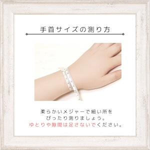手首を測ってそのままのサイズでオーダーしてください。制作時に手首サイズ+ゆとり1cmのサイズに仕上げます。