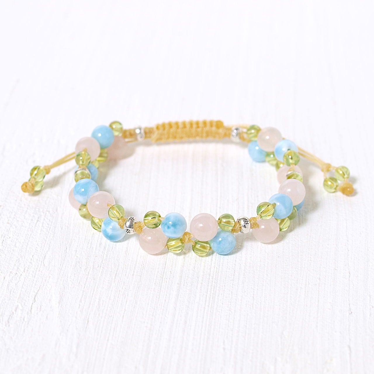ラリマー+ローズクォーツ+ペリドット花*花マクラメブレスレット