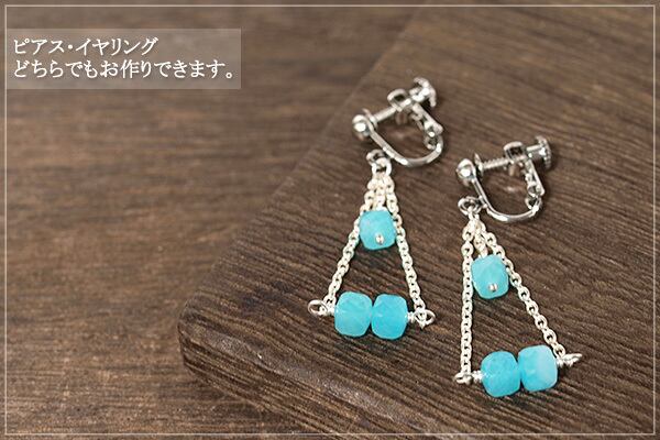 サイコロのようなキューブ型にカットした石を使っています。少し角が取れたようなソフトな四角で肌あたりが優しいです。表面にカットが入っているのでキラキラ輝きます。アマゾナイトシリカと呼ばれるタイプで、石英(クォーツ)部分が多く透明感があります。緑がかった明るいブルーで、粒によって色の濃淡差や白い縞模様が入る粒もありますが、こちらでバランス良く配置してお作りいたします。