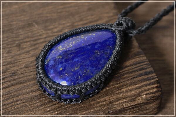 そこで思い切って、美しいラピスラズリのペンダントトップを仕入れ、金具を外してマクラメに仕立て直しました。よーーく見ると石の上部に穴が開いていますが、半分以上は編み目で隠れていますので、さほど目立たないと思います。