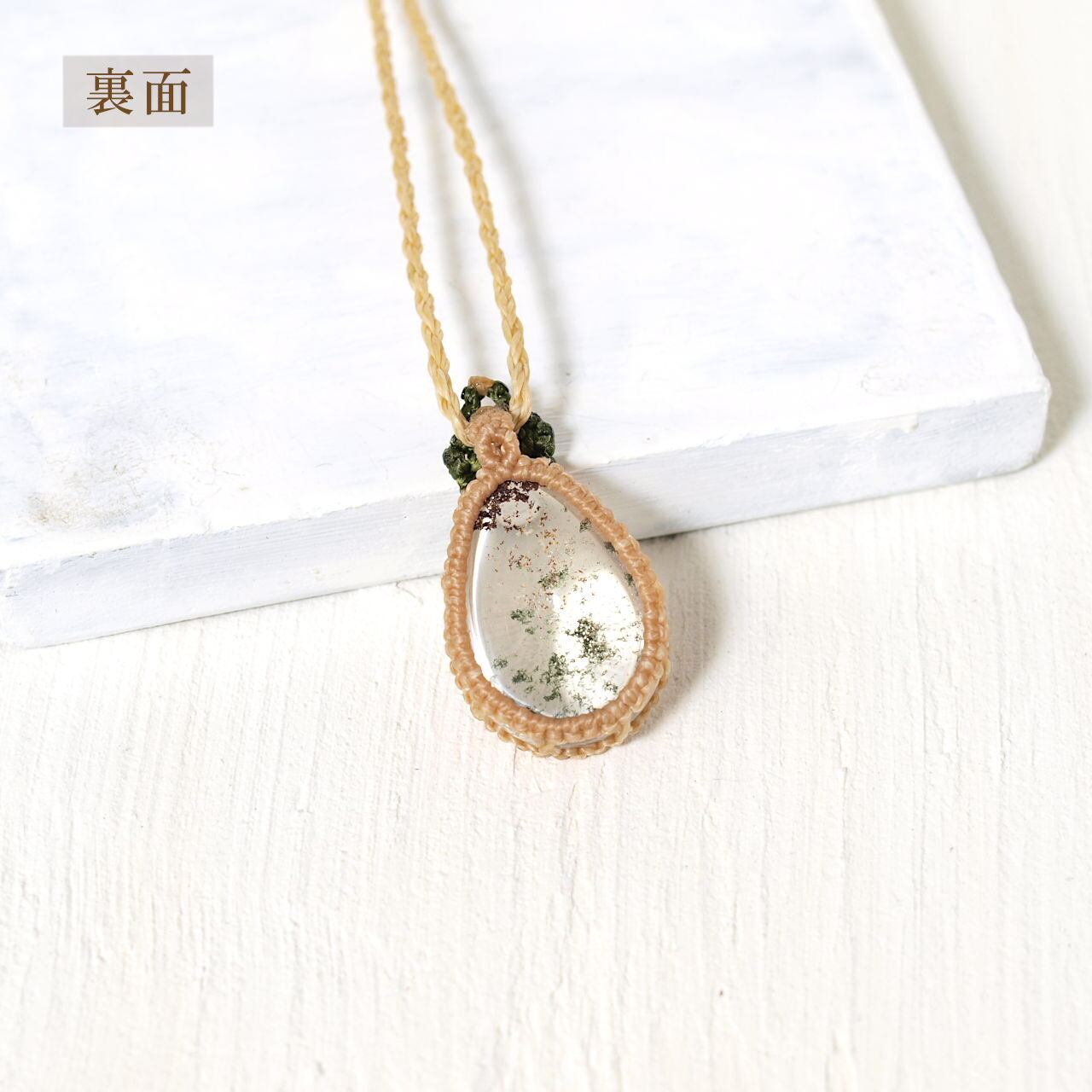 ガーデンクォーツの雫型ルースを包み込んだマクラメネックレスです。今回は特に水晶の透明度が高く、内包物が美しく見えるものを選びました。ガーデンクォーツをじっと見つめていると、時間を忘れ、心を解放して、とても自由で清々しい気持ちになります。