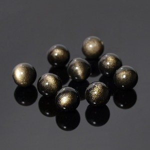 ゴールドオブシディアンは、黒い地色に金色の輝きが見られる美しい石。粒によっては輝きが弱かったり、見えにくい角度に光っているなど、多少の個体差はありますが、品質の良いものだけを選んで作りました。特に輝きが強いのは8ミリ玉。6ミリ玉は表面積が少ないせいか、輝きが小さく黒っぽい印象です。
