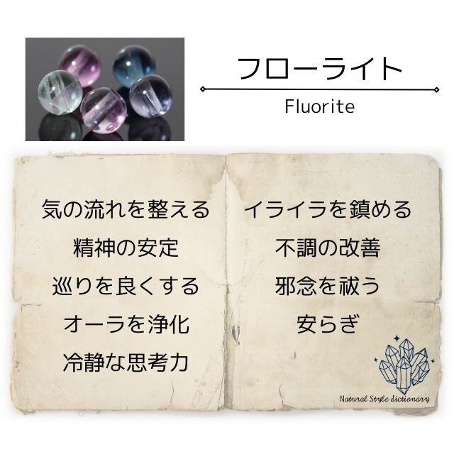 フローライトは精神と意識をさらなる高次元に導き、偏見や固定概念から開放して、大きな視点から自己を見つめられるよう導いてくれると伝えられています。人生は無限の可能性に満ちているということを教えてくれているのです。変化することを恐れず、流れに任せてみるのも時には良いかもしれません。