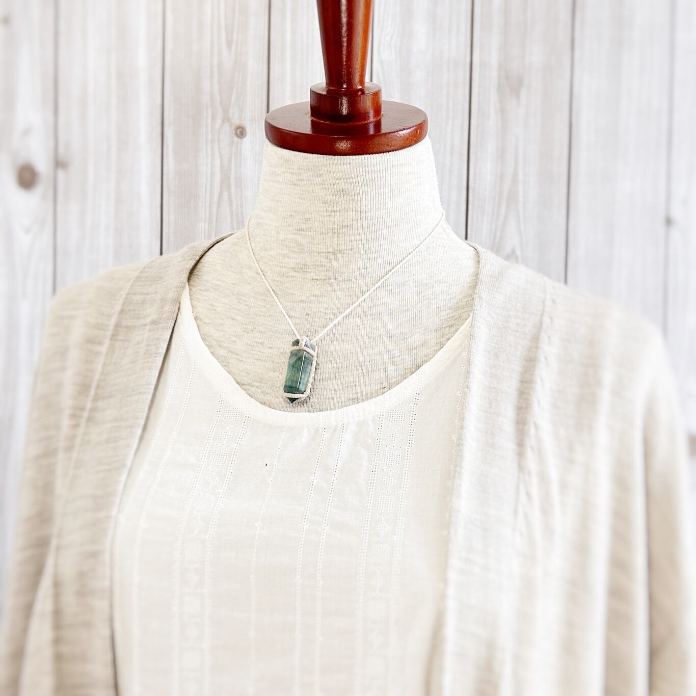 今回のマクラメネックレスはポイントの先端が体の中心に向くようにデザインしました。フローライトの優しい波動が体中に巡る心地良さを感じてみてください。