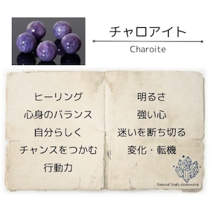 チャロアイトは世界三大ヒーリングストーンのひとつ。心身のバランスを整え、持ち主のエネルギーを浄化・解毒してくれる癒やしの石です。穏やかで心地よい波動で包み込み、優しさと純粋な気持ちを取り戻してくれます。チャロアイトの明るく陽気なパワーに刺激されて、自分らしさを素直に出せるようになるでしょう。ありのままの自分を受け入れる強さをもち、これまで人の目や評価が気になって後回しにしてきた想いを解き放って、行動に移せるよう導いてくれます。