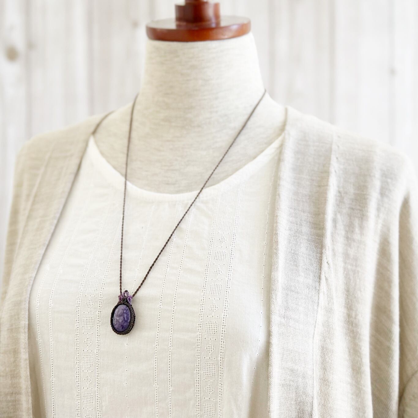 【一点物】チャロアイトのオーバルルースを包んだマクラメネックレスNo.5
